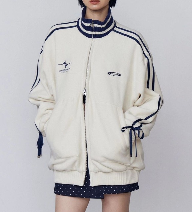 配色リブや袖山のラインテープがポイント ■デザイン フリース素材を使用したメンズライクなオーバーブルゾン。 寒すぎない時期にぴったりなアウターです。 裏地付きで寒くなった際も中に着込むことが出来るので長い期間着用して頂けます。 袖山のラインテープの先はリボンデザインになっており手元が映える印象です。 ハイネックジップデザインなので、開けると大きな襟のようになり2WAYで楽しんで頂けます。 また、逆開ファスナー仕様で裾からも開けることが出来るので抜け感のある着用のバランスを楽しめます。 ■スタイリング オーバーサイズでカジュアルな印象なので、 フェイクレザーラップスカートやカーブウエストミニスカート等のミニスカート合わせがおすすめです。 ※着用画像はフラッシュの加減で実際の製品と色味等が異なる場合がございますので、生地のアップ画像をご確認ください。 ※ご利用の端末画面の設定により実際の商品と色味が異なる場合がございます。 【商品特徴】 透け感:なし 伸縮性:なし 生地の厚さ:普通 サイズ感:ゆったり 裏地:あり ポケット:あり(前) メーカー品番:042550230301 色:アイボリー/グレー/ブラウン サイズ:Fサイズ バスト124cm 着丈69.5cm 袖丈54cm 肩幅56cm 定価:10,800+税 素材:表地:ポリエステル100% 裏地:ポリエステル100% リブ:ポリエステル98% ポリウレタン2% テープ部分:ポリエステル100% 原産国:中国製