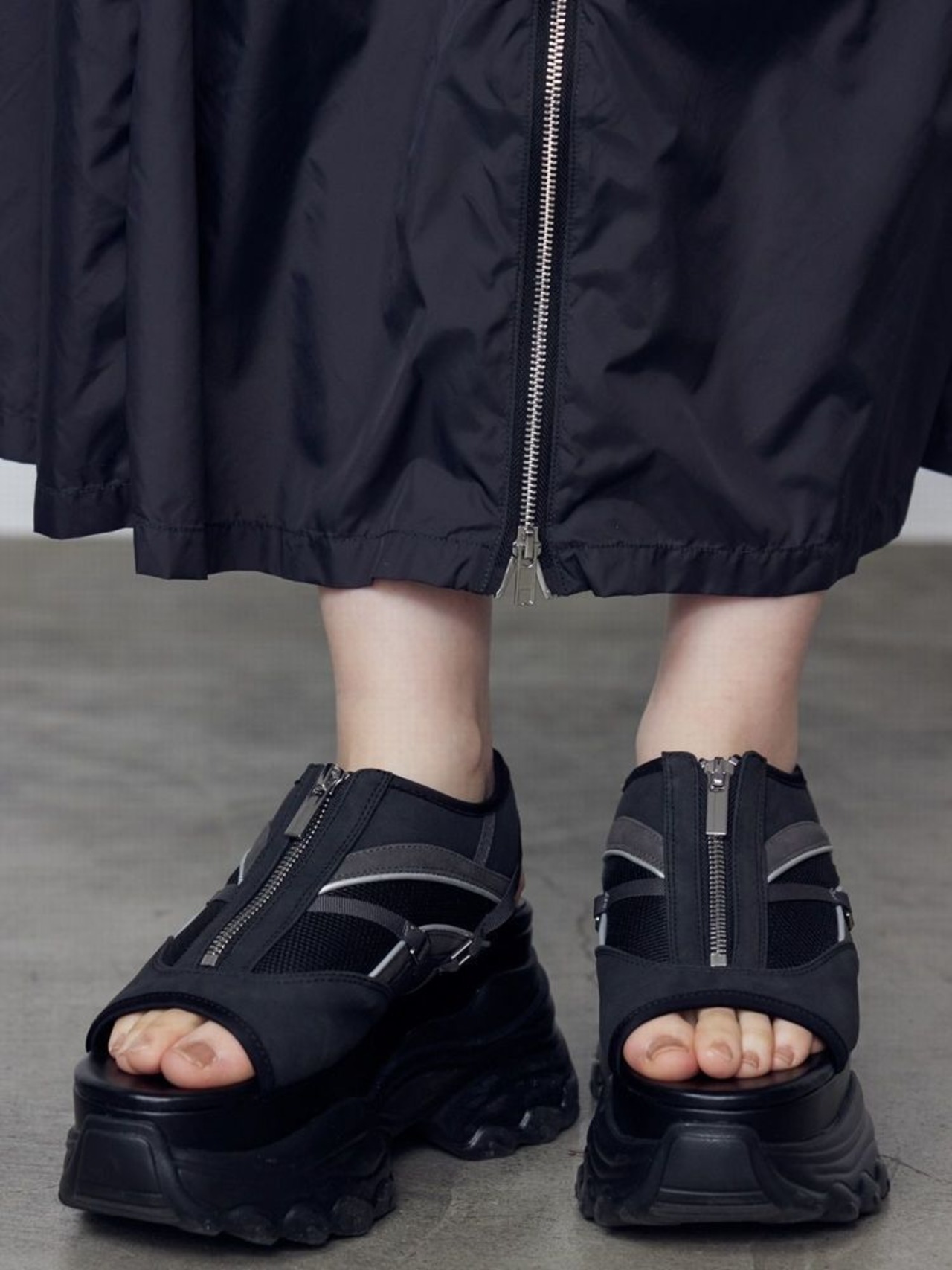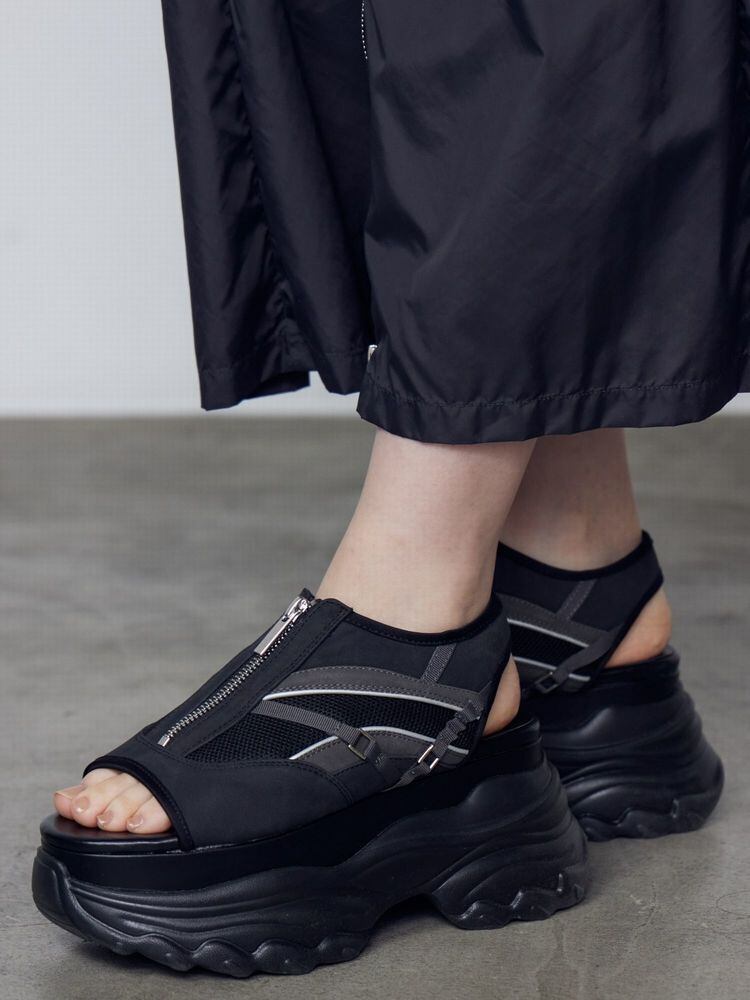 スニーカーサンダルですが、サイドの切り替えとテープのデザインがモードな印象に。