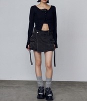 カーゴラップショートパンツのようなミニボトムにソックスを合わせるスタイリングもおすすめです。