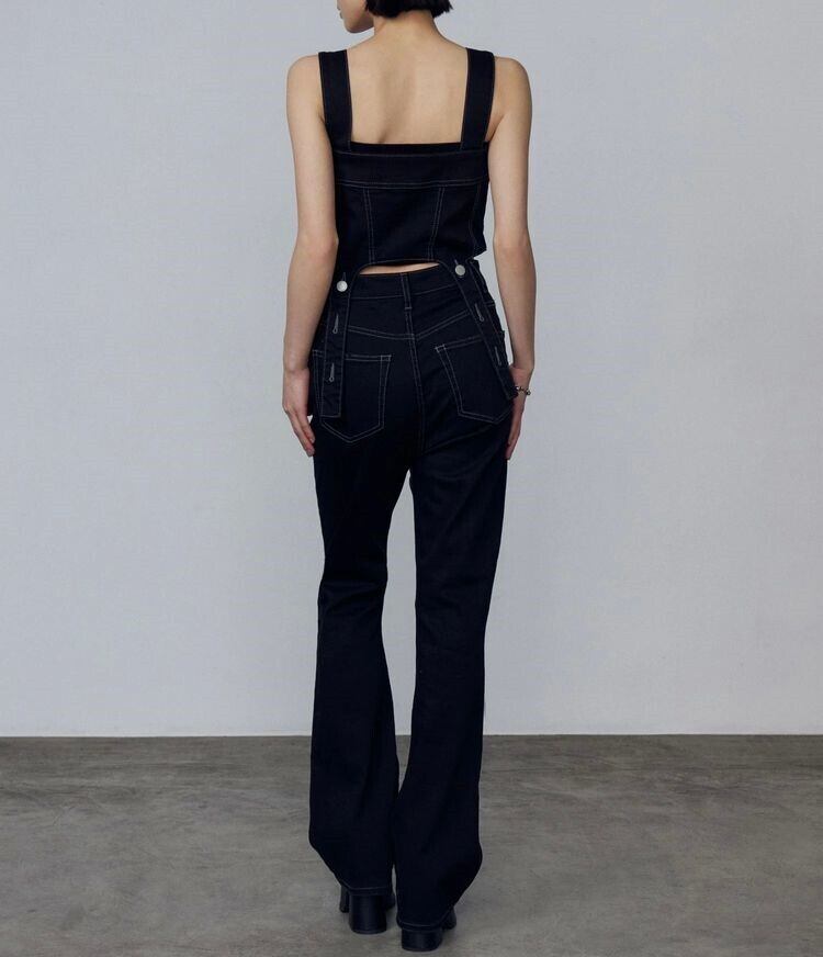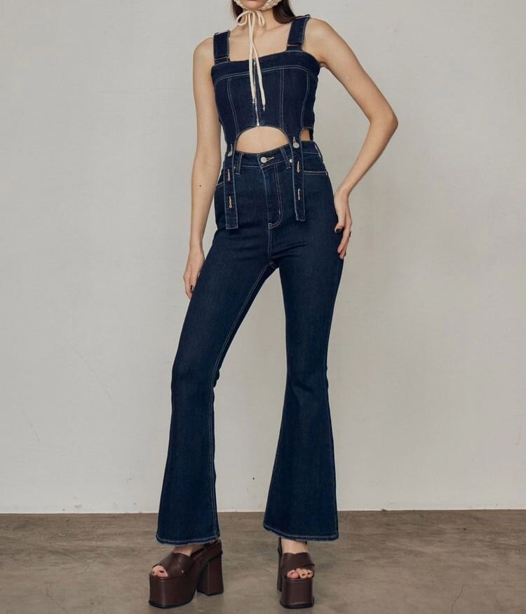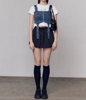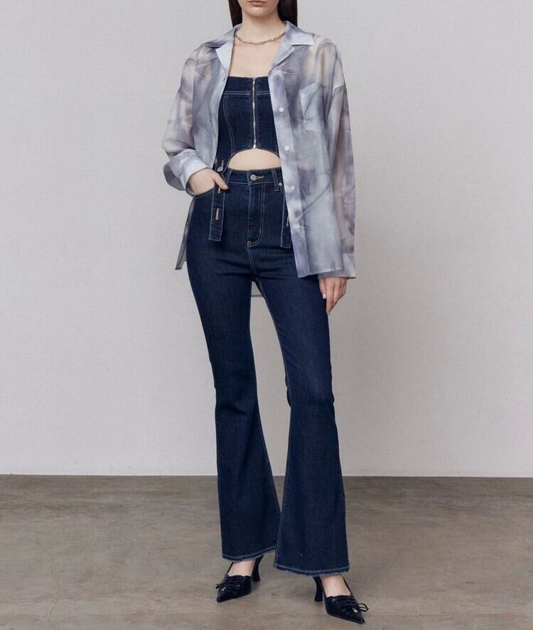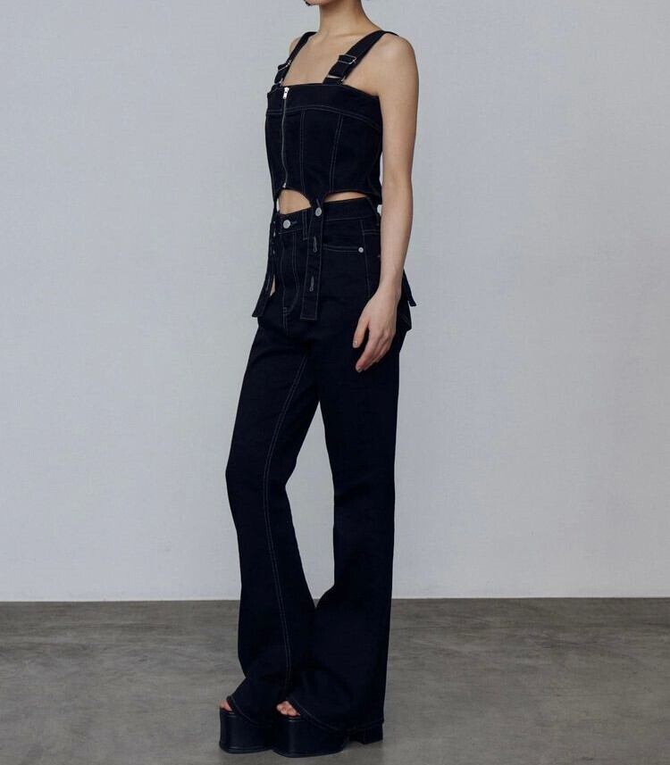 デニムビスチェとフレアジーンズでそれぞれスタイリングが楽しめます。