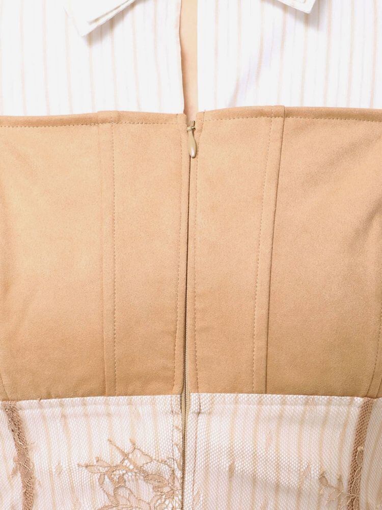 素材:[アイスブルー]ストライプ部分:ポリエステル68% 綿32% レース:ナイロン100% ビスチェ:ポリエステル71% レーヨン23% ポリウレタン6% 部分使い:綿63% ポリエステル37% 見返し:ポリエステル81% 綿19%[ブラウン]ストライプ部分:レーヨン59% 再生繊維(セルロース)27% ナイロン14% レース:ナイロン100% ビスチェ:ポリエステル93% ポリウレタン7% 部分使い:綿63% ポリエステル37% 見返し:ポリエステル81% 綿19%[ベージュ]ストライプ部分:ポリエステル67% 綿33% レース:ナイロン100% ビスチェ:ポリエステル93% ポリウレタン7% 部分使い:綿63% ポリエステル37% 見返し:ポリエステル81% 綿19%