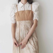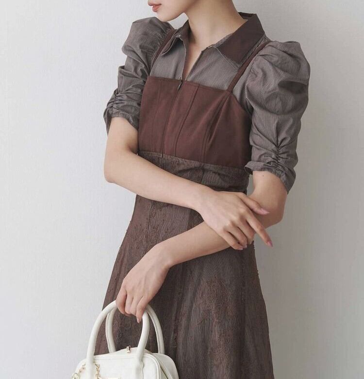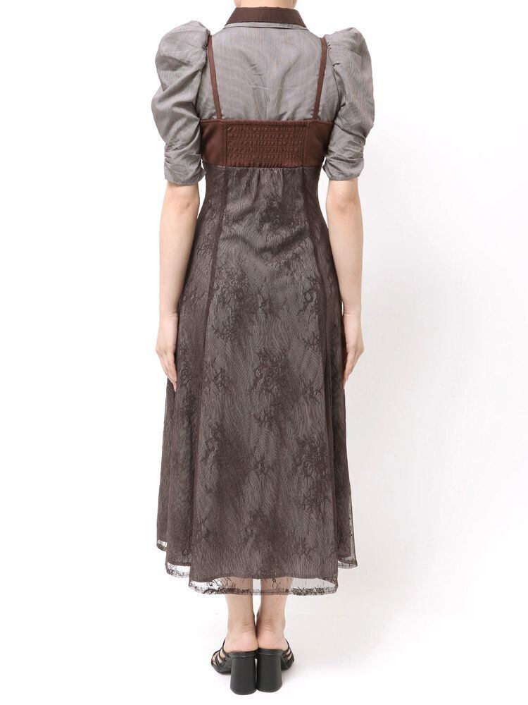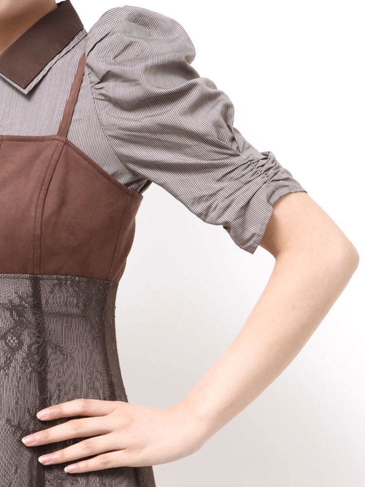 ハイウエスト切り替えのビスチェ風キャミワンピースとパワショルシャツワンピースをドッキングさせてスタイルアップ。