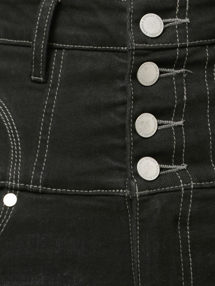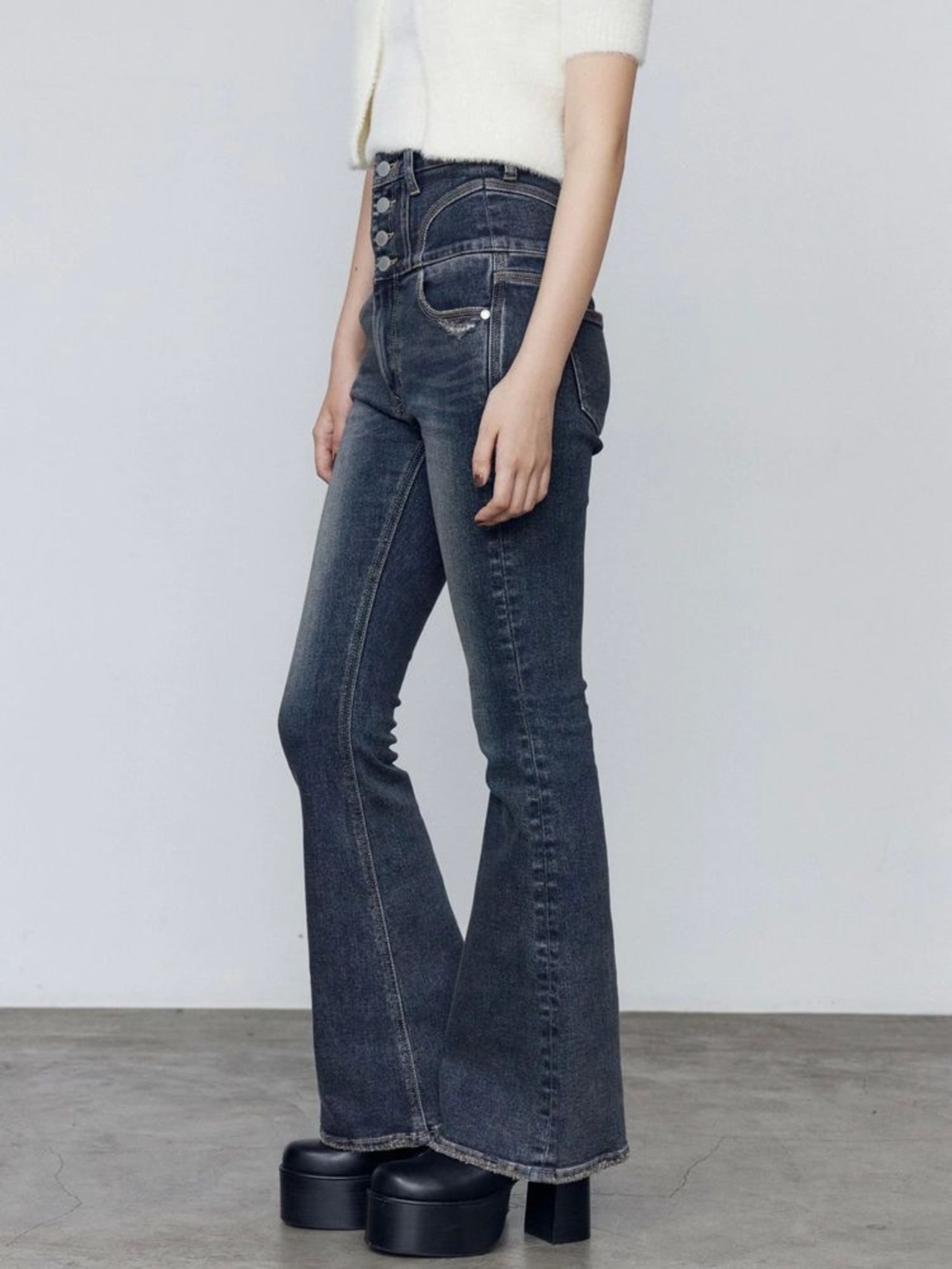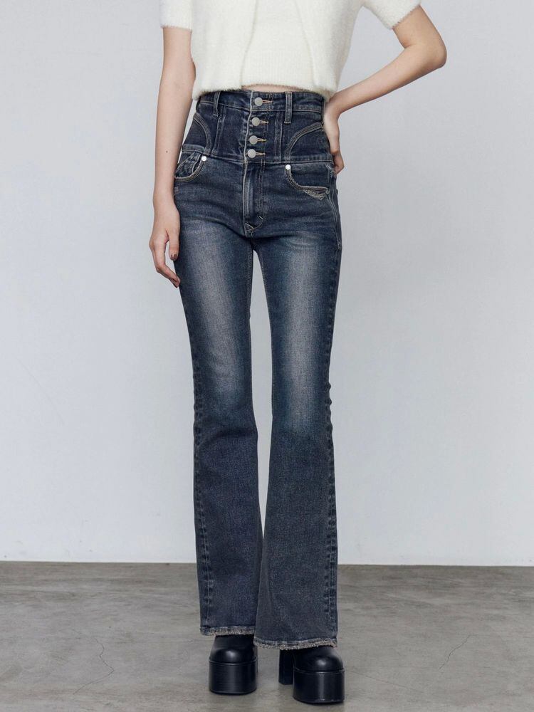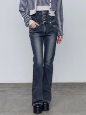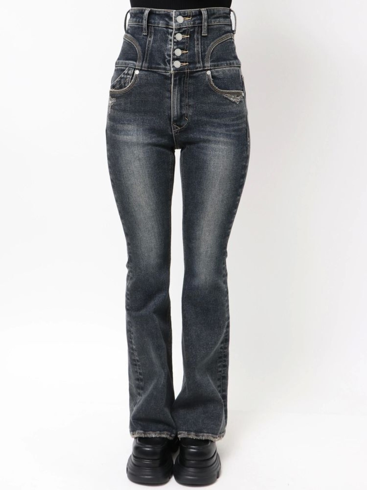 ウエストからポケットに繋がるカーブ切り替えデザインが特徴的なハイウエストパギンスです。しっかり深めの4つ釦デザインとフレアシルエットでスタイルアップのスタイリングが楽しめる1本です。