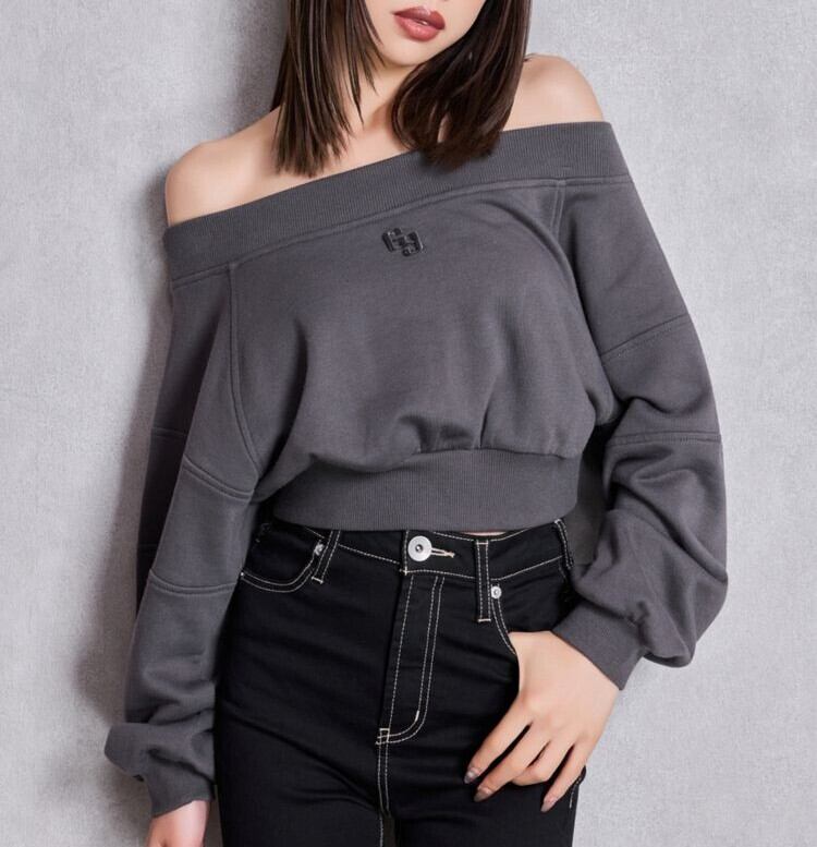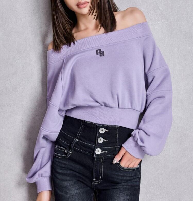 ぱっと目を引くキャッチーなカラーがポイントのオフショルショートトップスです。