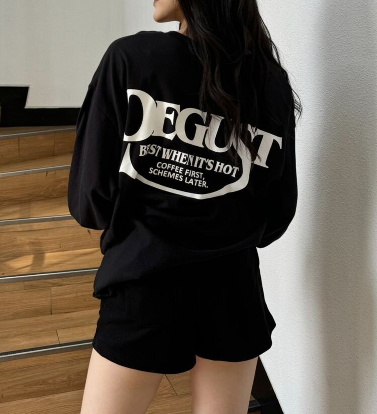 セットアップの大きめパーカーを着用しても右裾のロゴが見えるデザインなのでコーデがのっぺり見えしません◎