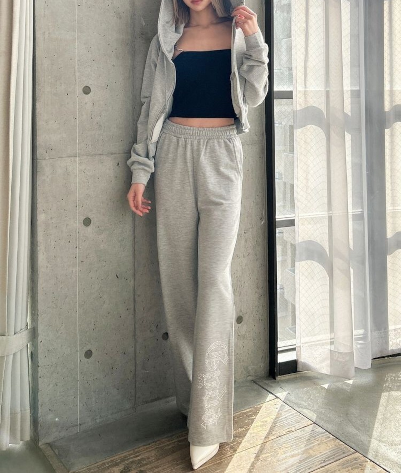 セットアップのショートパーカーとの着用がおすすめです。