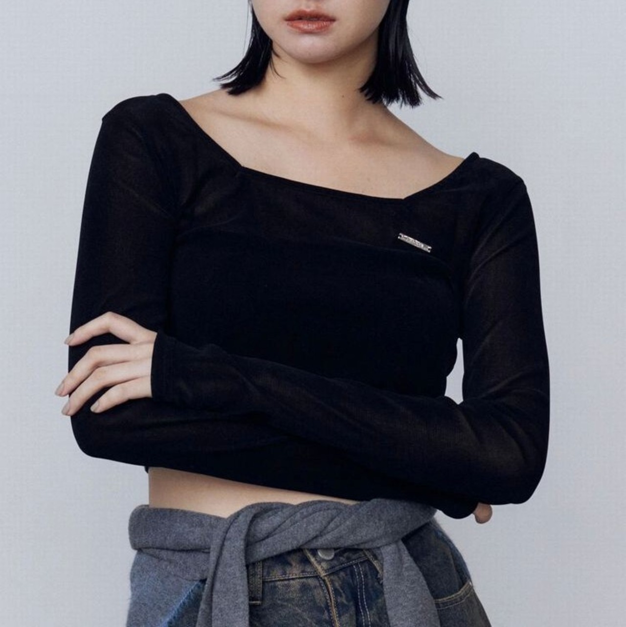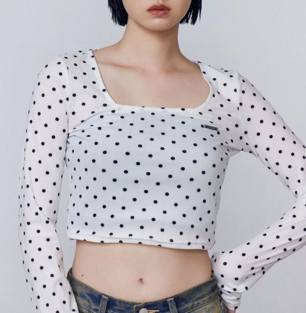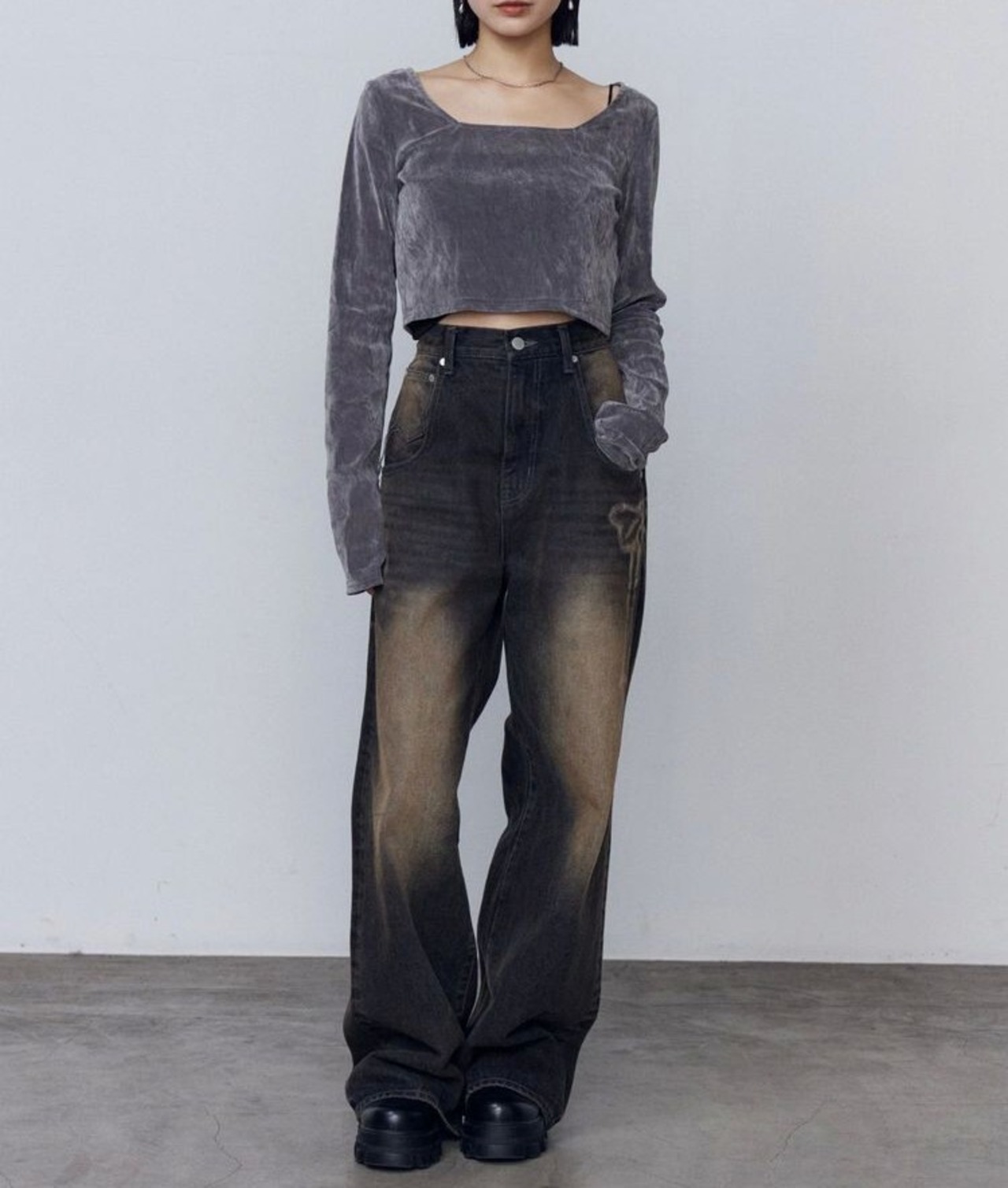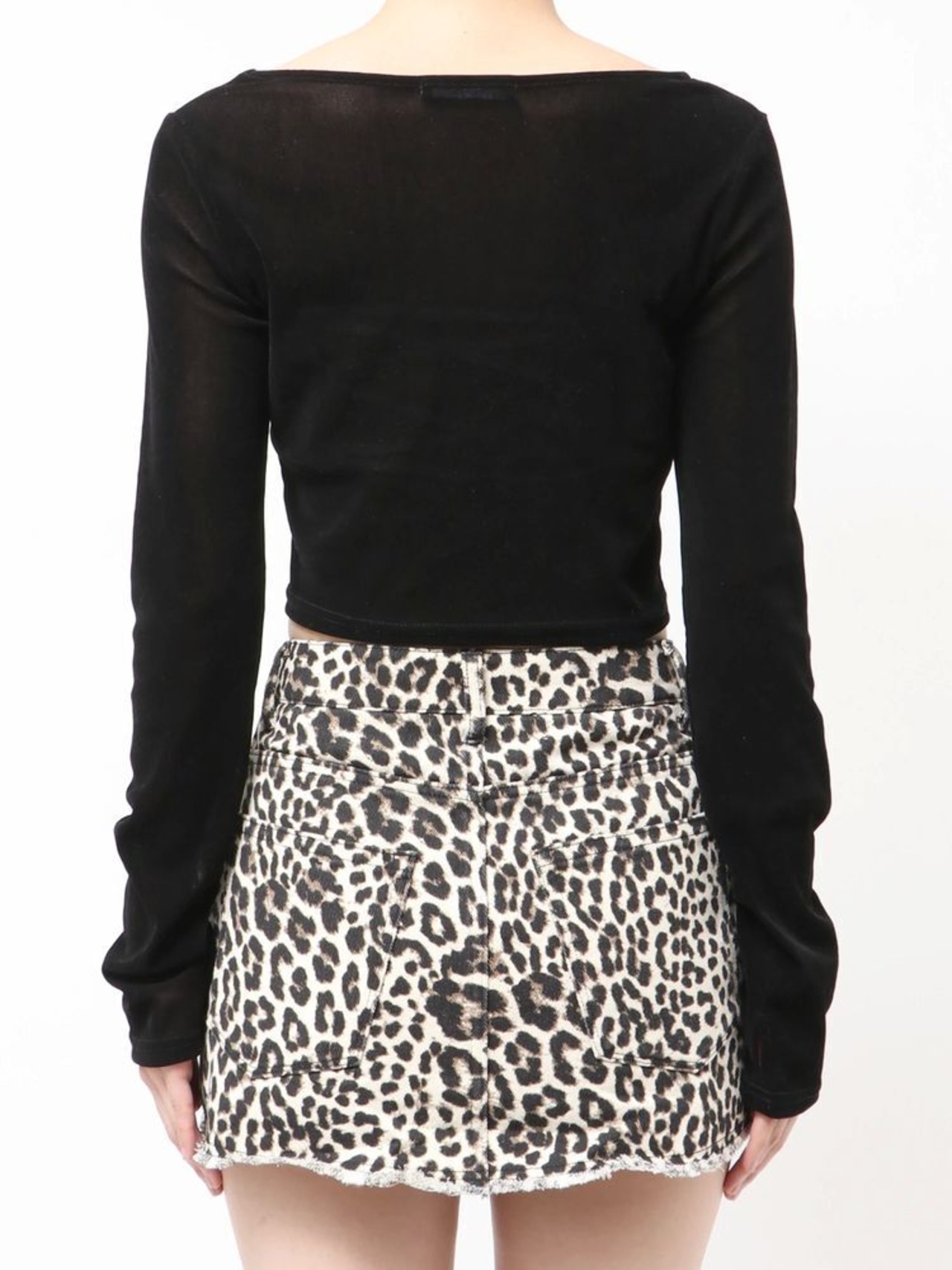 クロップド丈なので、スーパーハイウエストフレアパギンスやリボングラフィックルーズジーンズのようなハイウエストボトムとの合わせがおすすめ。