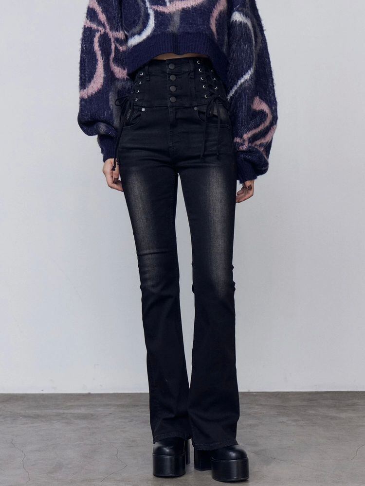 ハイネッククロップニットやリボンラインショートニットのようなショート丈との合わせがおすすめ。ウエスト周りのレースアップデザインを見せるバランスがイチオシです。