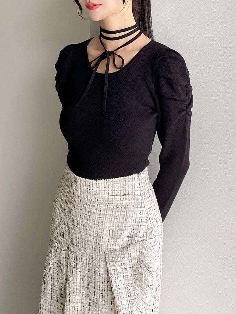チョーカーは取り外しもできるのでシンプルなニットとしても使え、
