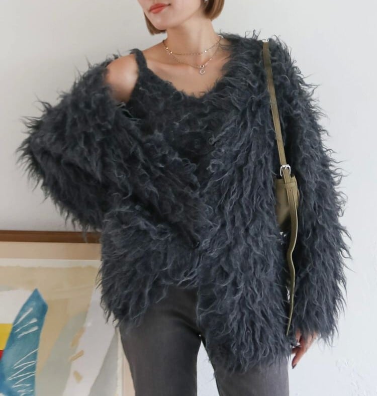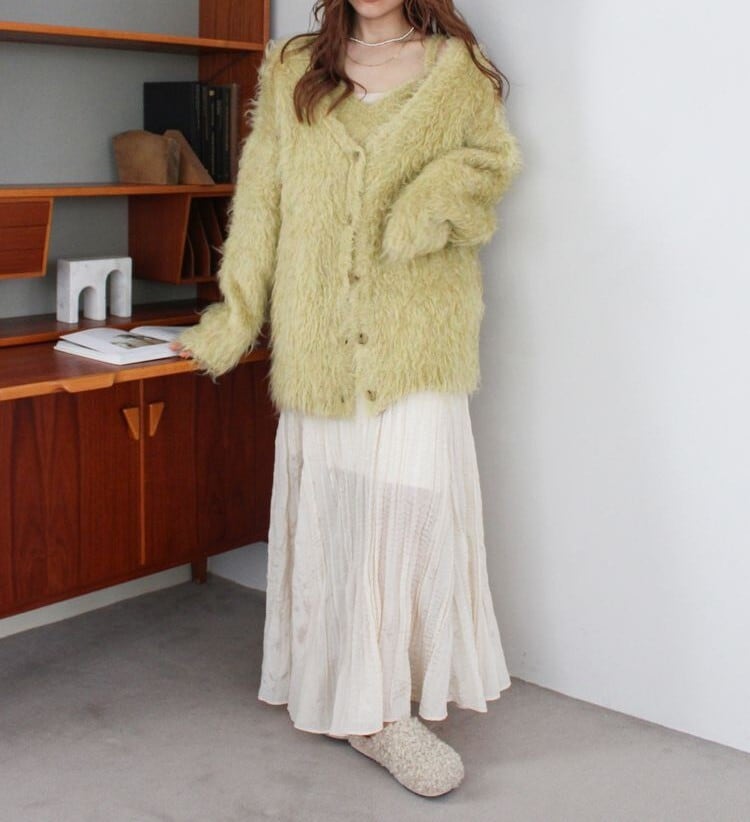 カーディガンはルーズなサイジングで腰回りも少し隠れるような丈感です。