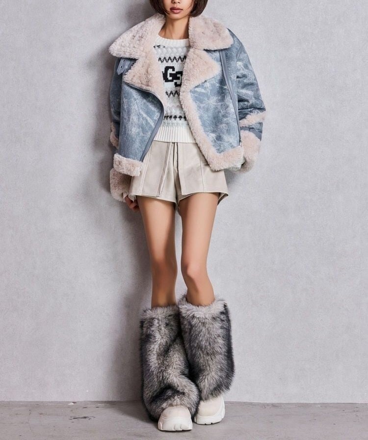 フェイクレザースカート+厚底ブーツでエッジィに。