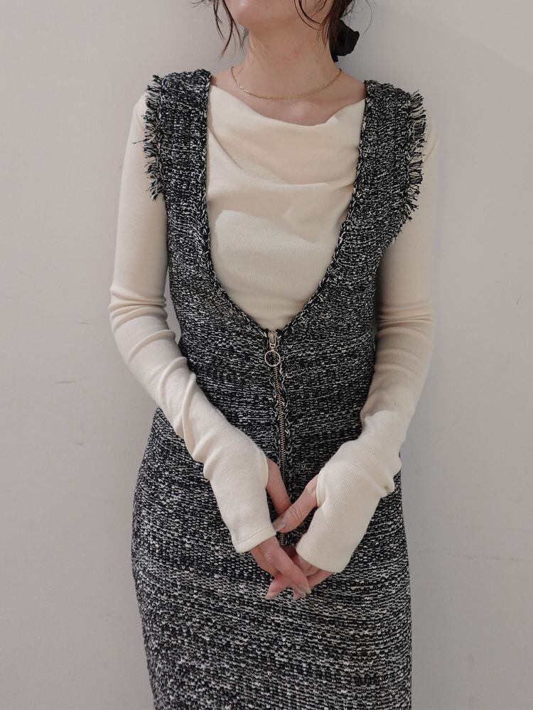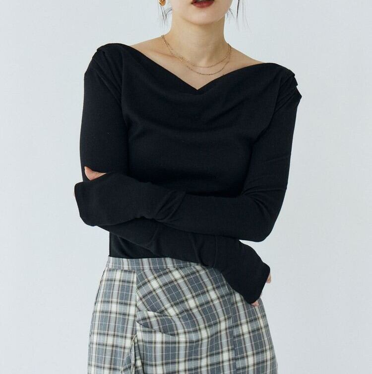 両肩にタックを施し肩に乗せ着用すると胸元がドレープします。
