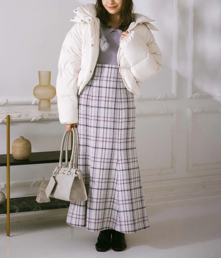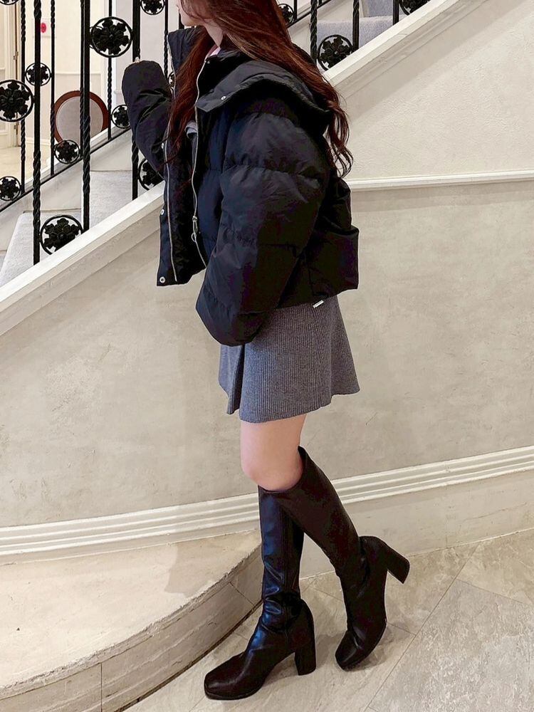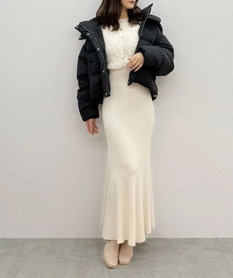 ショート丈なので、ボトムには落ち感のあるロングスカートやワンピース、ニットワンピース合わせがおすすめです。