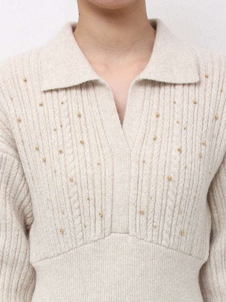 ケーブル柄にメタルビジューを散りばめたデザインが胸元を華やかに見せてくれるニットワンピース。