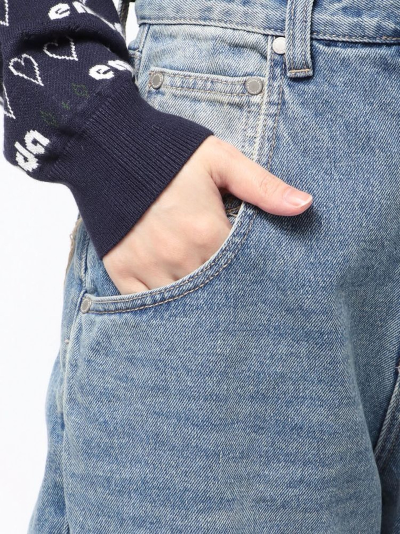 低めのポケットや、ステッチ端の糸を垂らして残したコインポケットなどもポイントです。