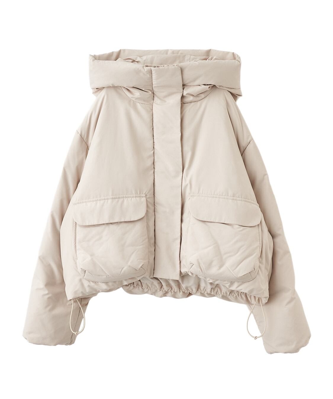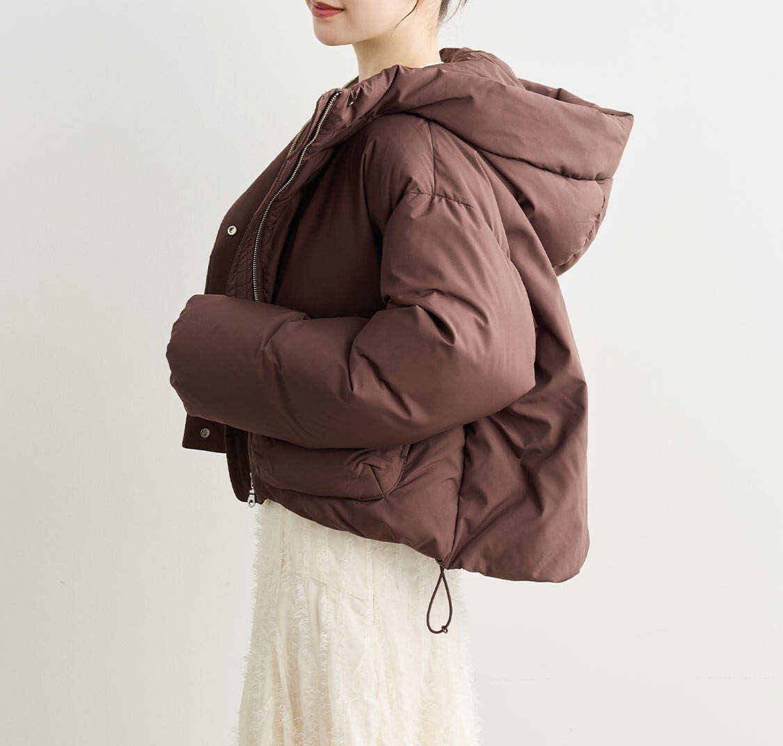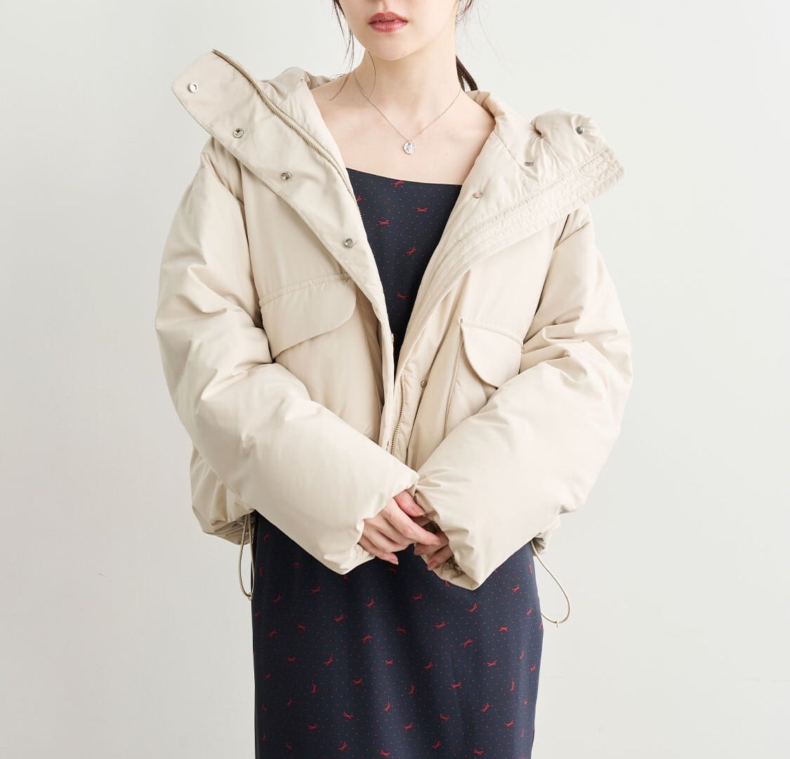 コロンとしたコンパクトな丈感のフードダウンコート。マットな光沢がある素材を使用し、ダウン90%フェザー10%でとても軽く保温性があり暖かさも抜群です。ダウンの分量にこだわり、着ぶくれしないように仕上げました。フードが顔回りにくるようにパターンにこだわり小顔効果◎ポケットは丸い形状で柔らかい印象に仕上げながらも、サイドからも手が入れられる実用性も兼ね備えたデザインに。ダウンの中でもコンパクトな印象なので普段ダウンを着ない方にもおすすめしたい一着です。程よい丈感なので、スカートにもパンツにもワンピースにも合わせやすい優秀アウターです。