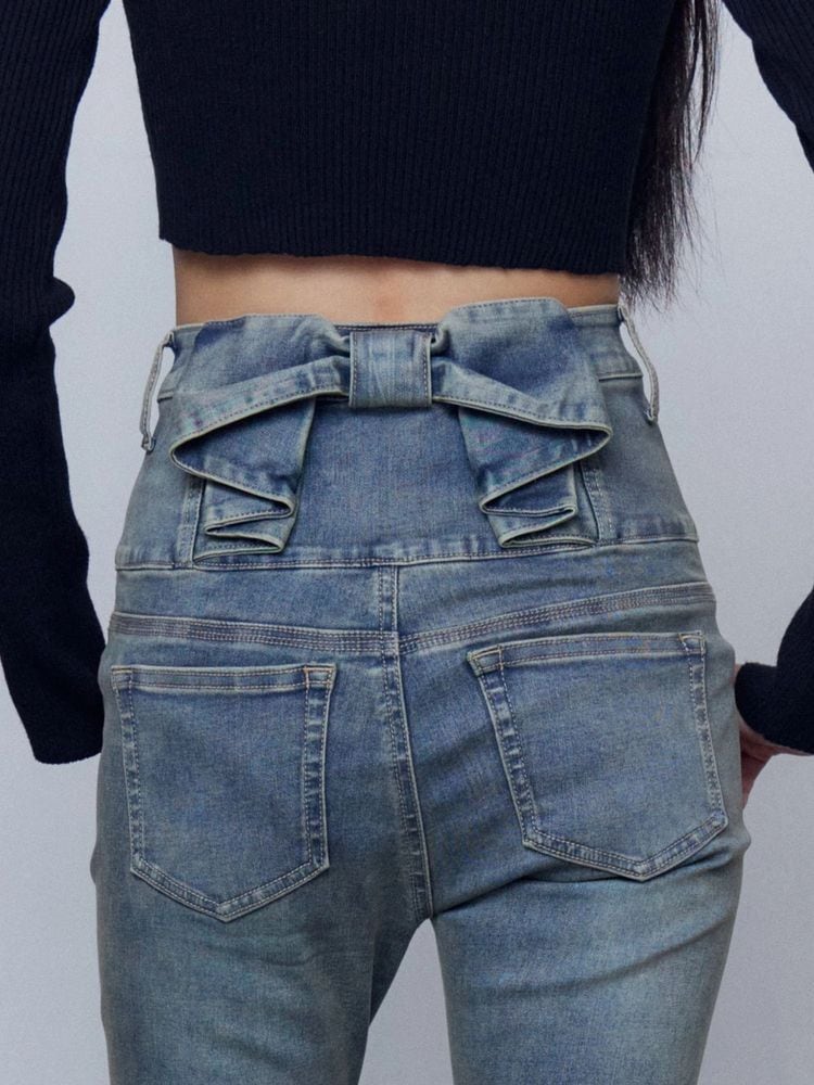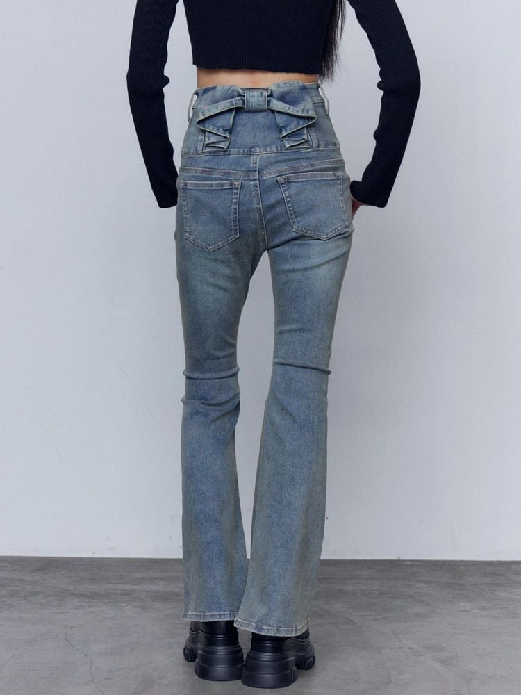 バックのリボンが目線を上にあげてくれるので、ラウンドサイドゴアブーツのような厚底ブーツを合わせるとよりスタイルアップ効果があります。