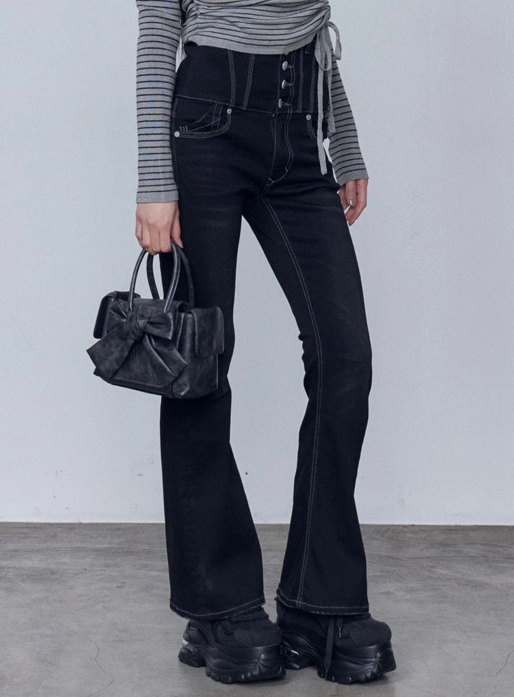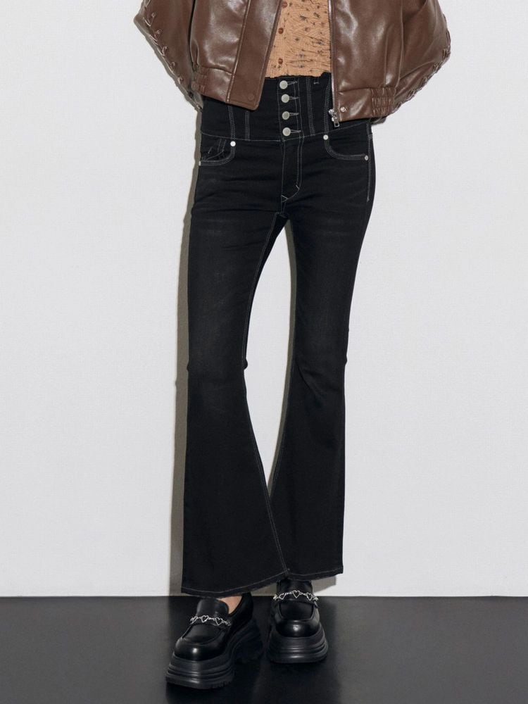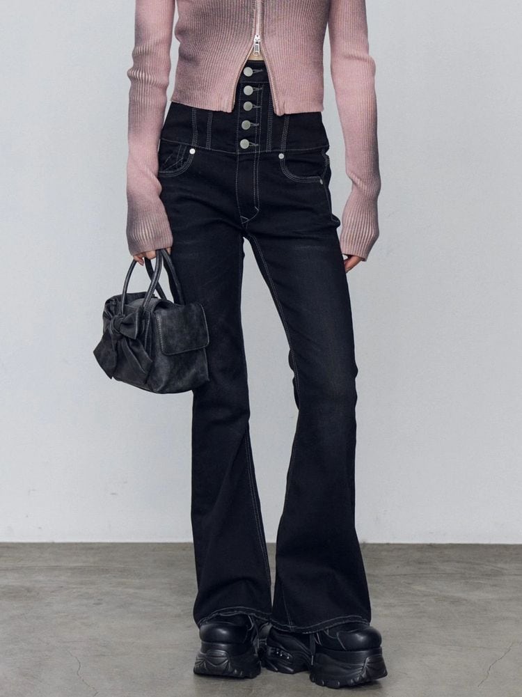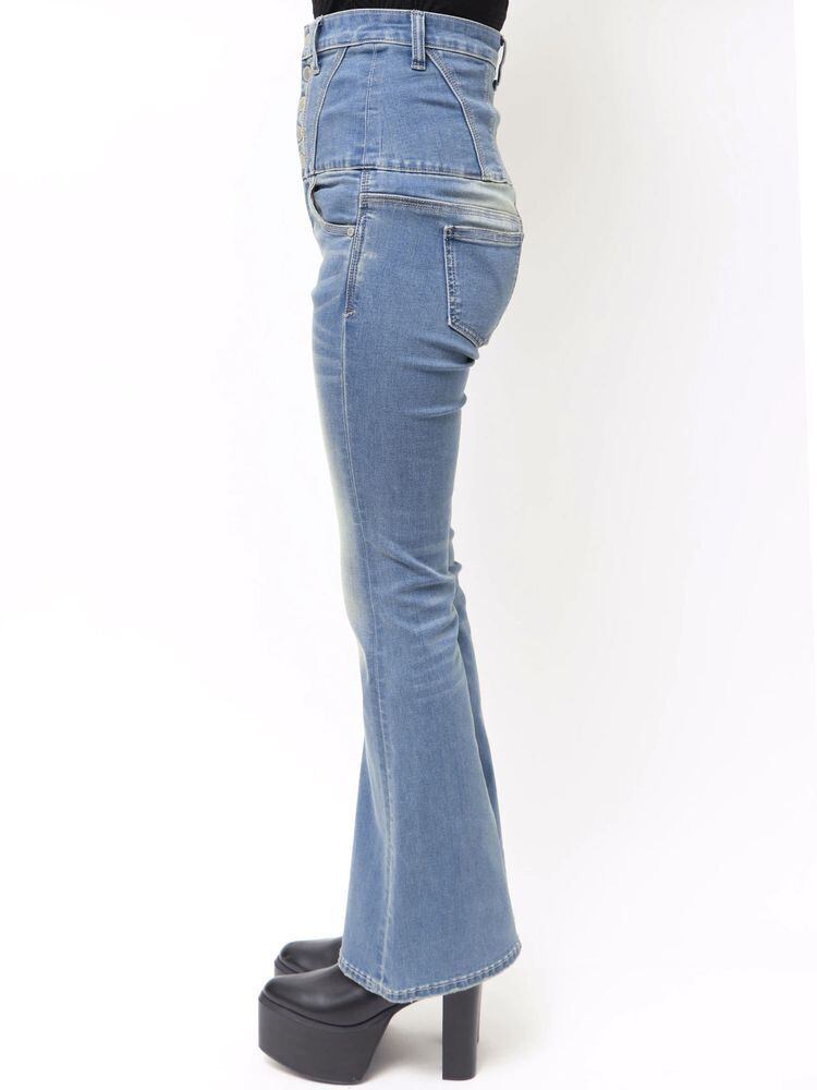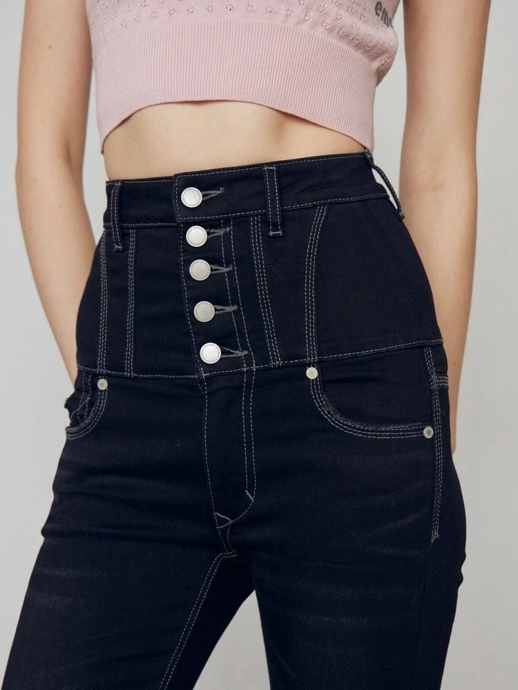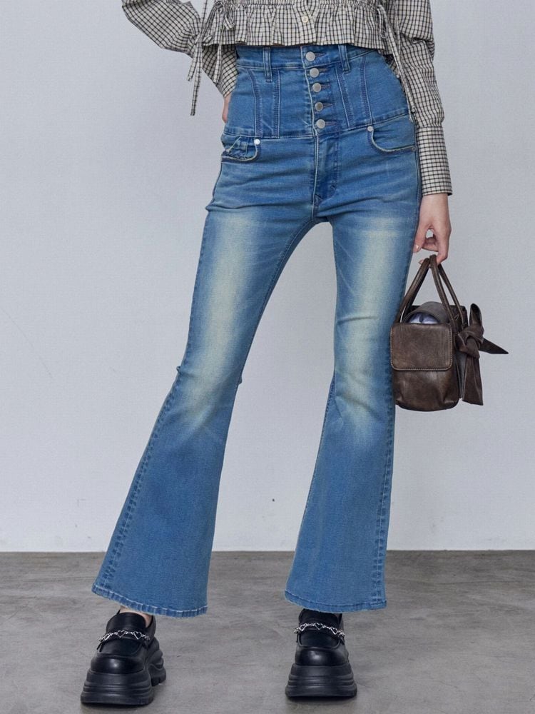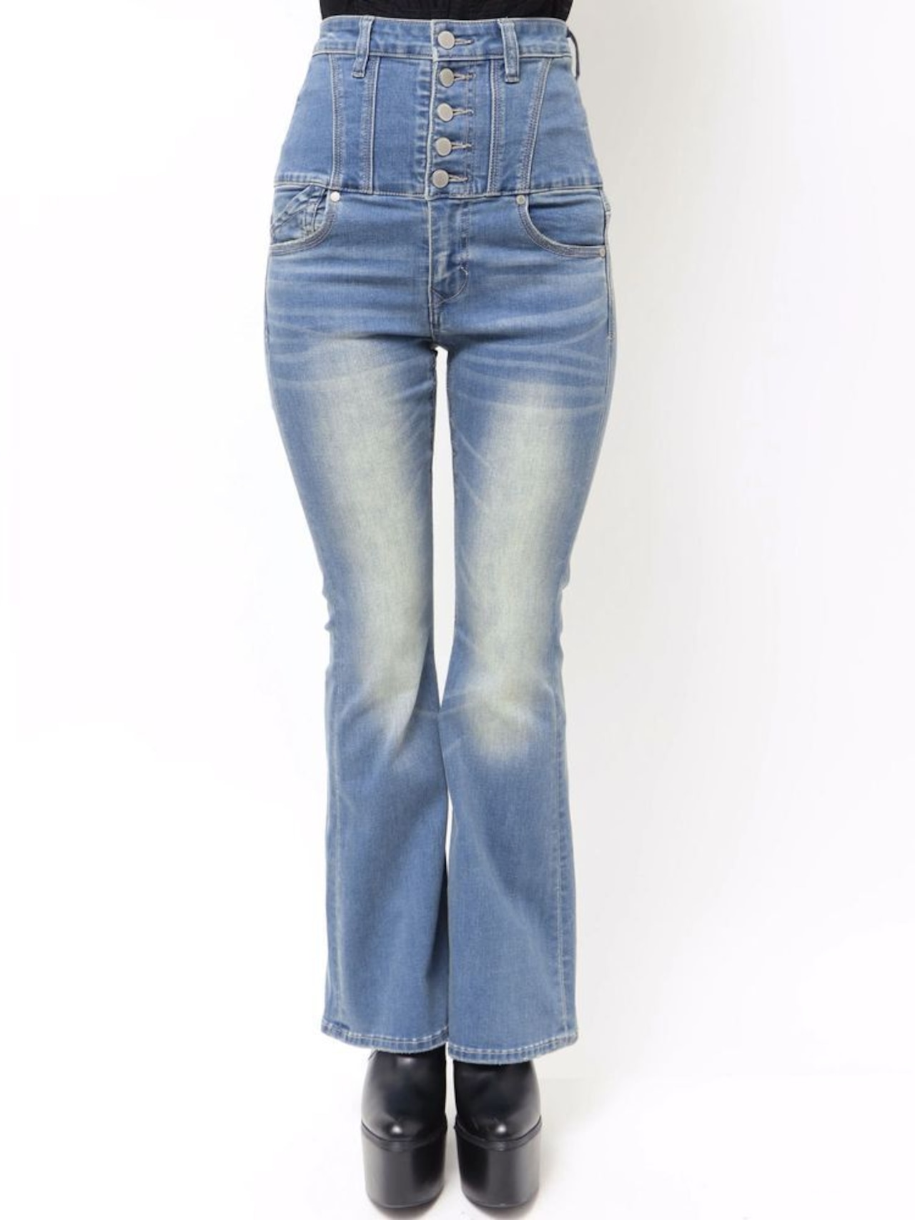 5つ釦デザインのスーパーハイウエストフレアパギンス