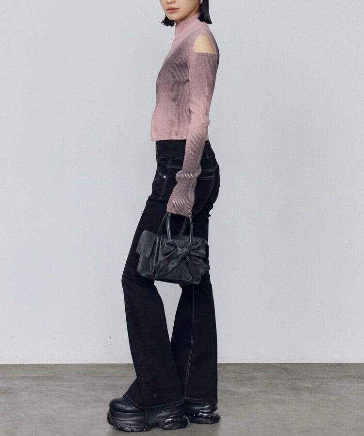 アシンメトリーチョーカーギャザーニットのようなショート丈トップスとのスタイリングがイチオシ。