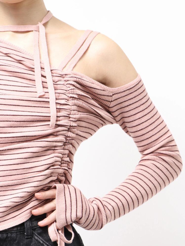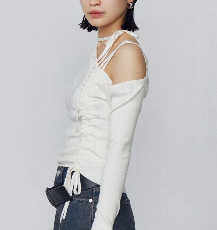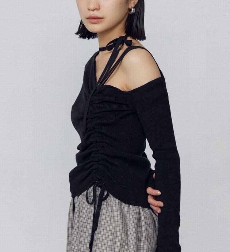 ネックのチョーカーデザインや身頃のシャーリングリボンがポイントです。
