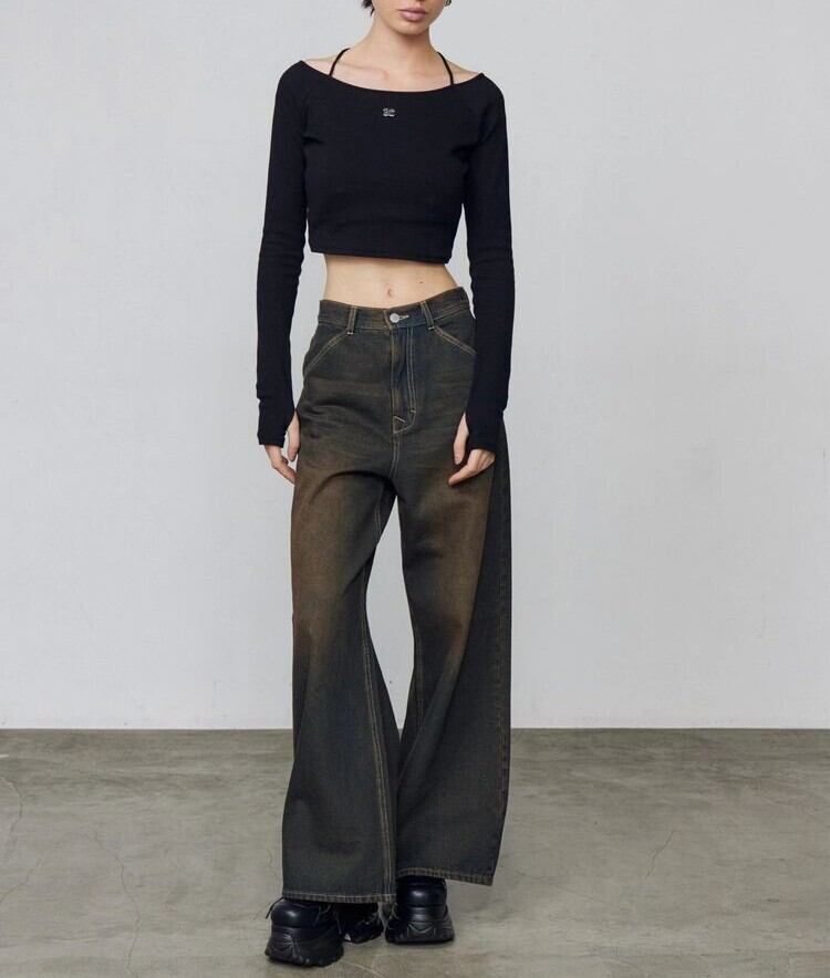 タイトなシルエットなので、ワイドルーズジーンズのようなワイドボトムと合わせたメリハリのあるスタイリングがおすすめ。