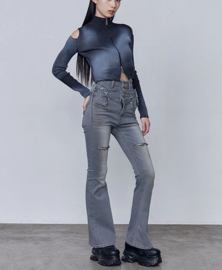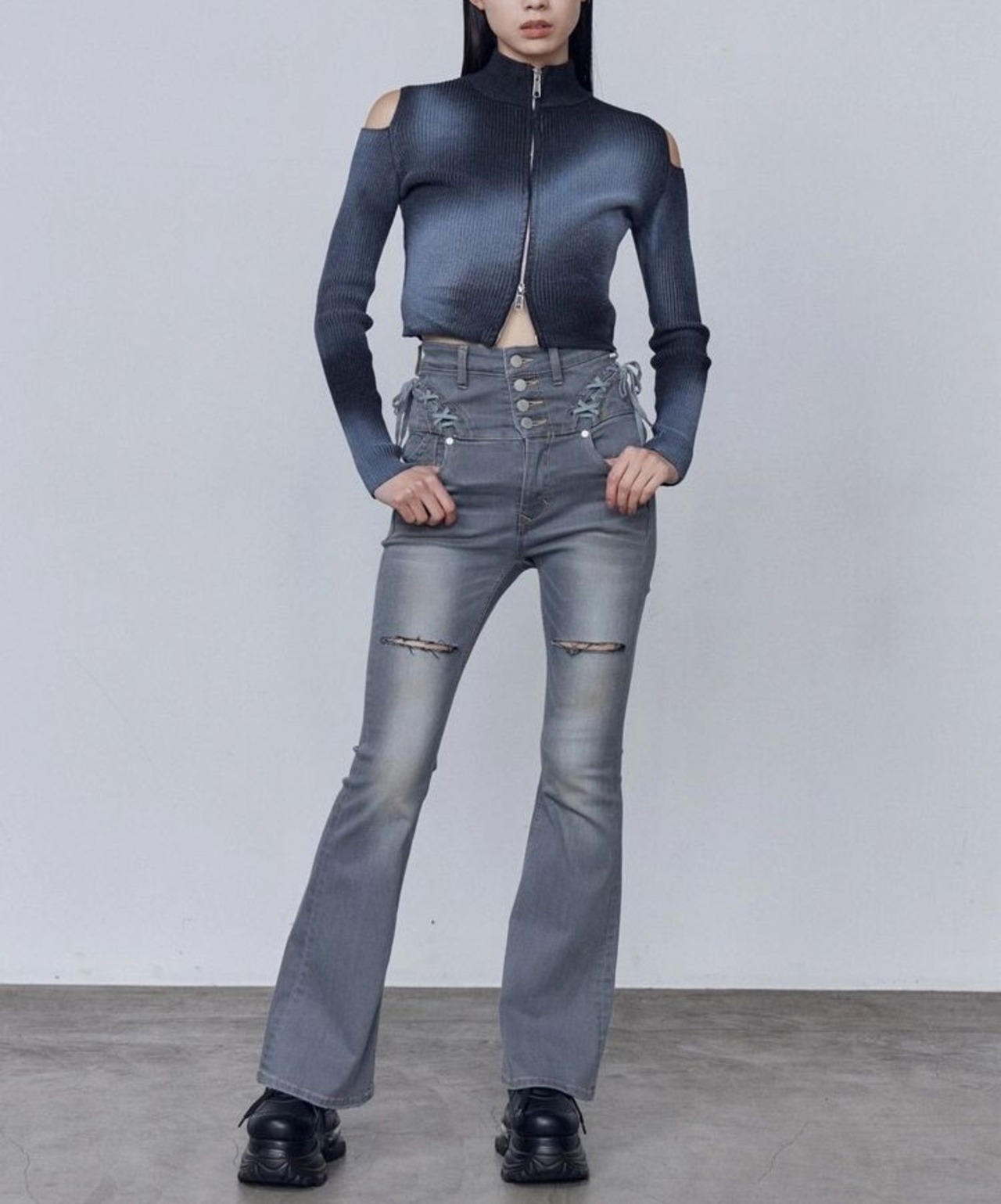 ショート丈なので、カーブレースアップハイウエストフレアパギンスを合わせたスタイルアップコーデがイチオシです。