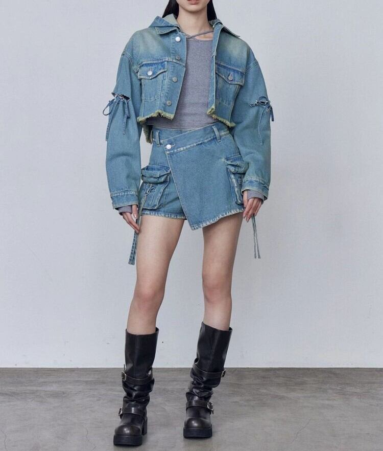 同素材のカットスリーブフードデニムブルゾンとのセットアップがイチオシ。