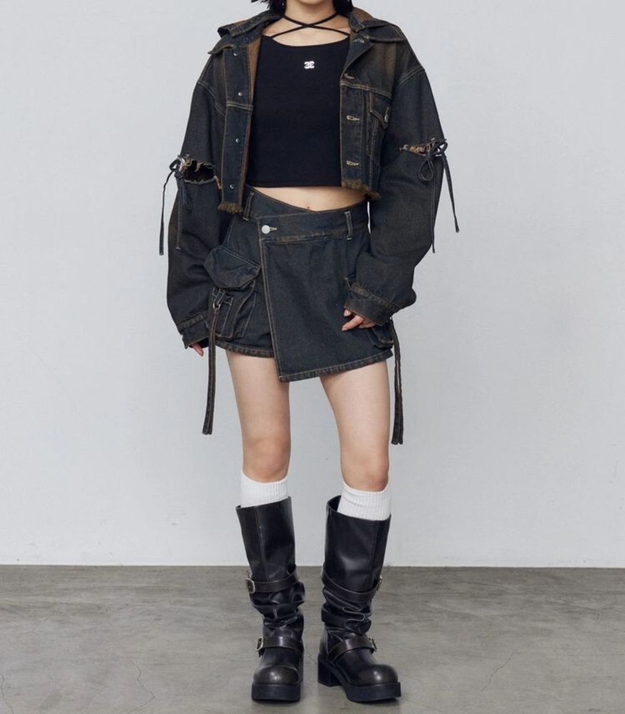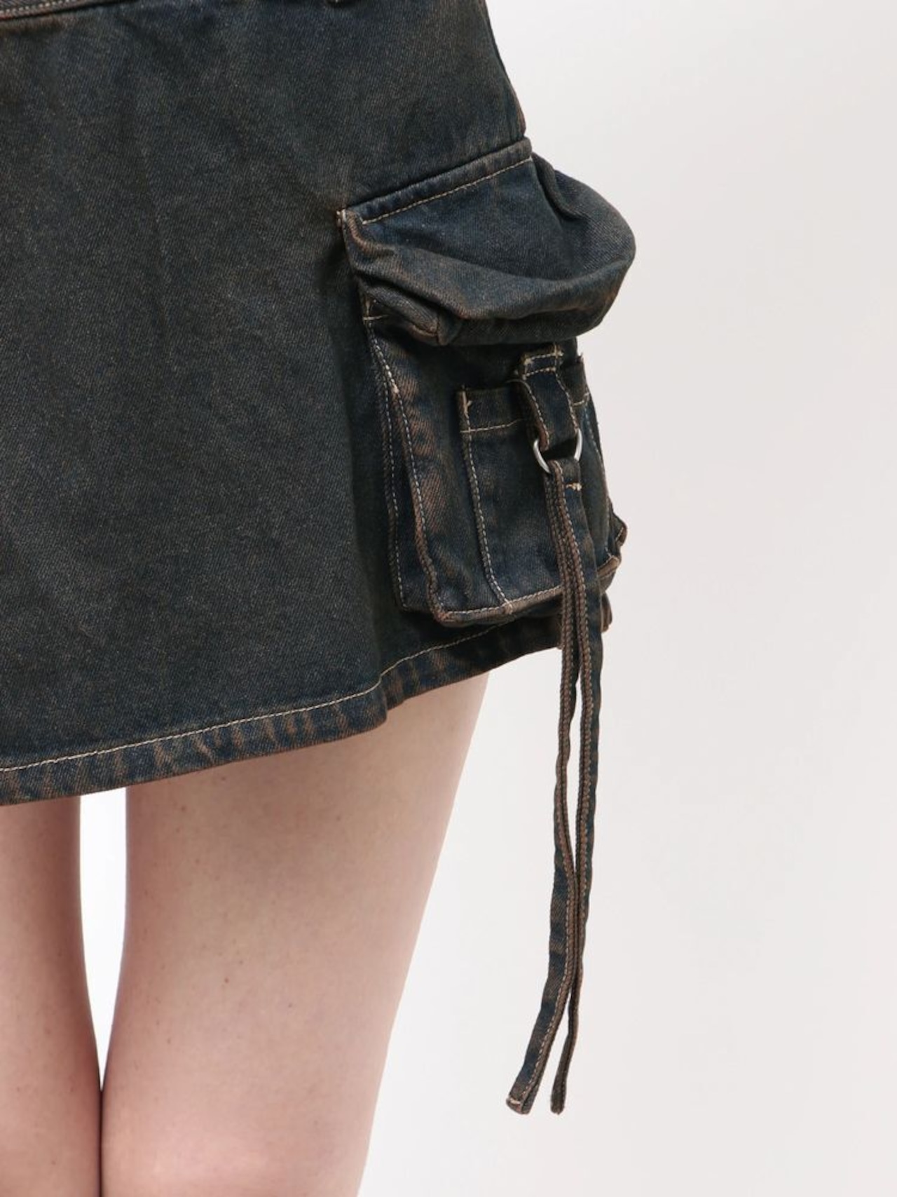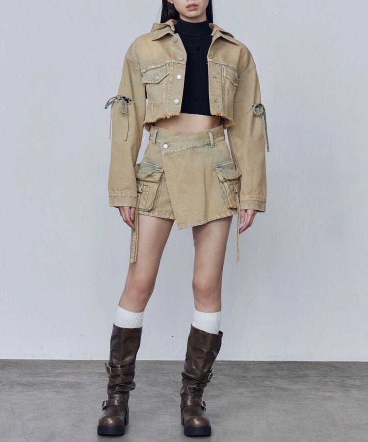立体的なアウトポケットや、動きのある紐ディテールがポイント。