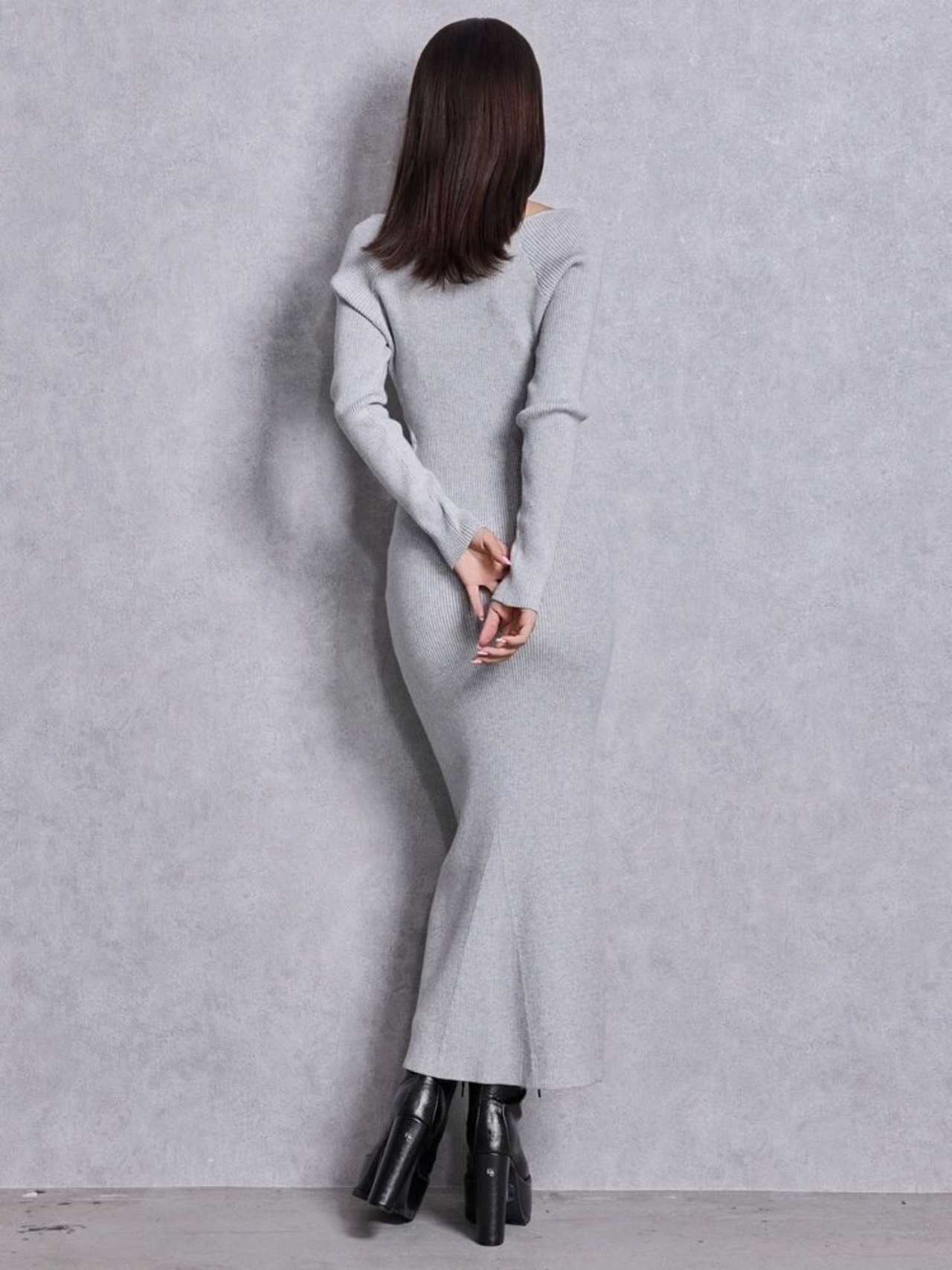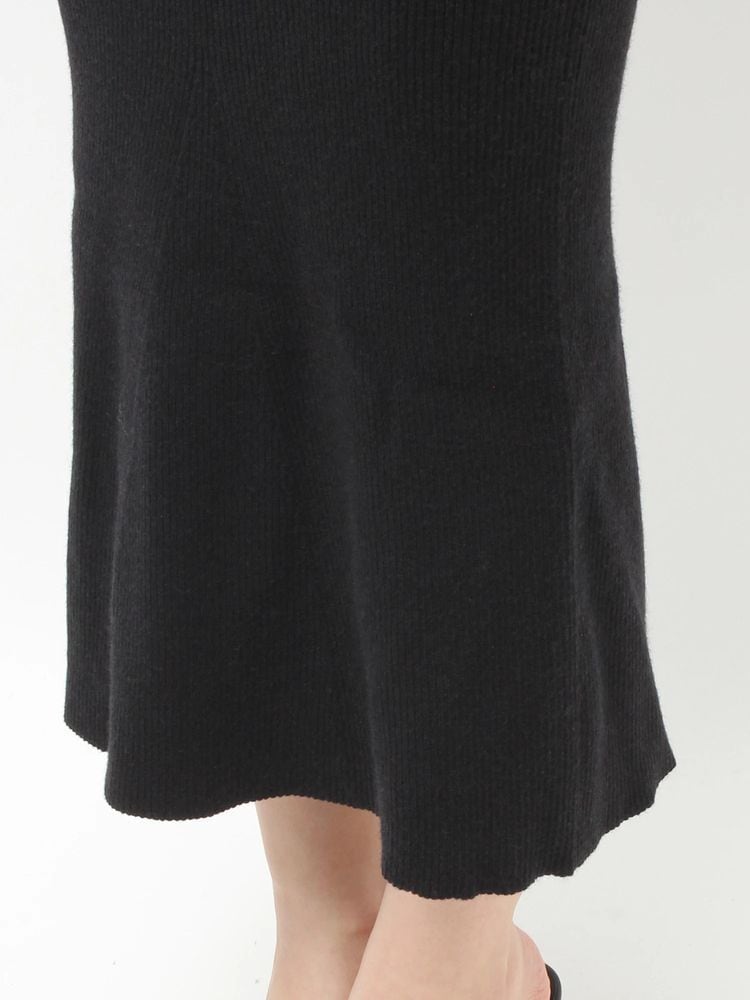 もっちりとしたリブ編みニット素材を使用したフレアシルエットのロングワンピース。