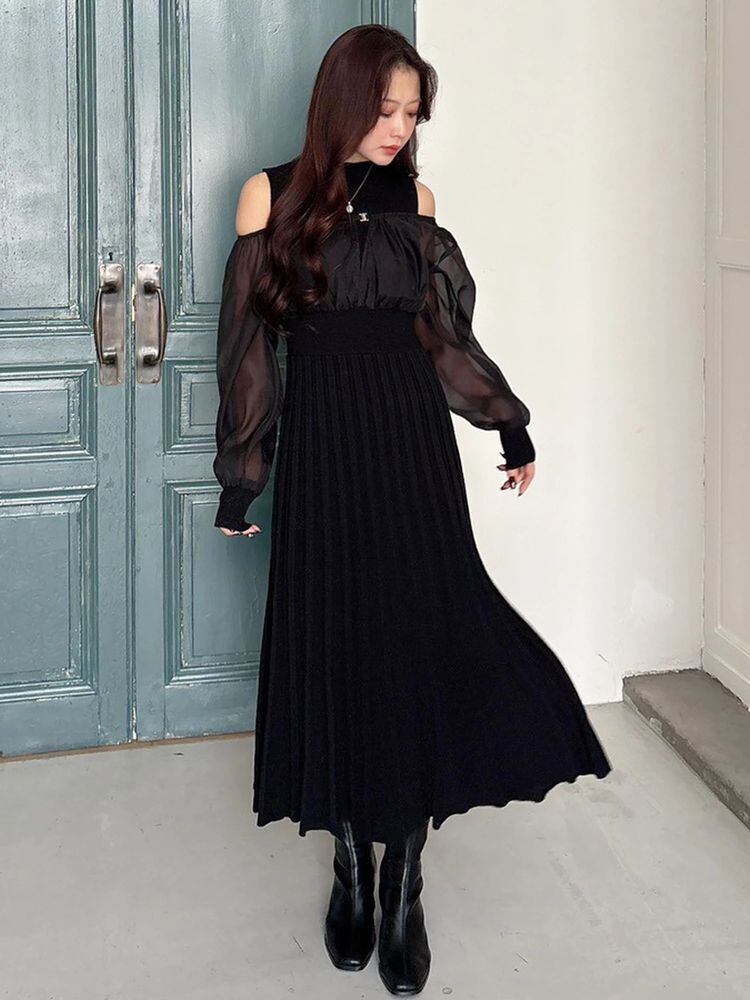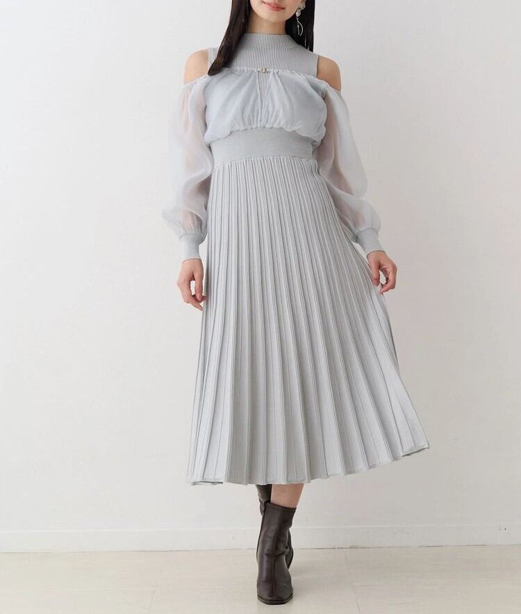 【MERCURYDUO】異素材ドッキングプリーツフレアニットワピース