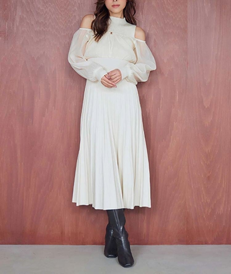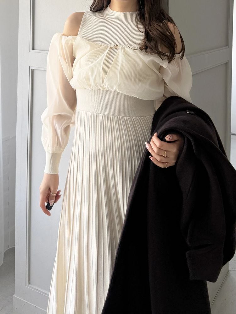 中に重ねたニットワンピは、ノースリーブのボトルネック×ウエスト切替えのフィット&フレアシルエットで、上品さと女性らしさを自然に引き立てます。