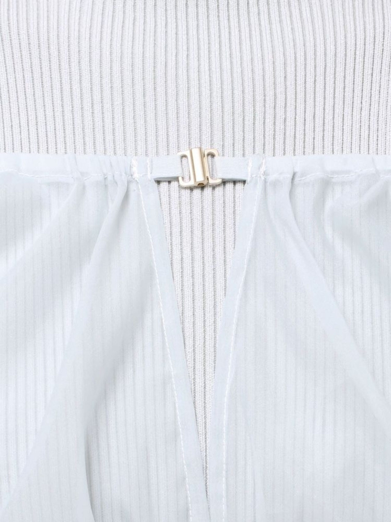 胸元にはメタルパーツをあしらい、アウターを羽織った時でもさりげなく華やぐアクセントに。