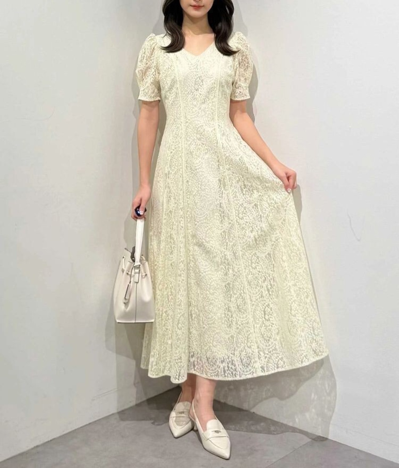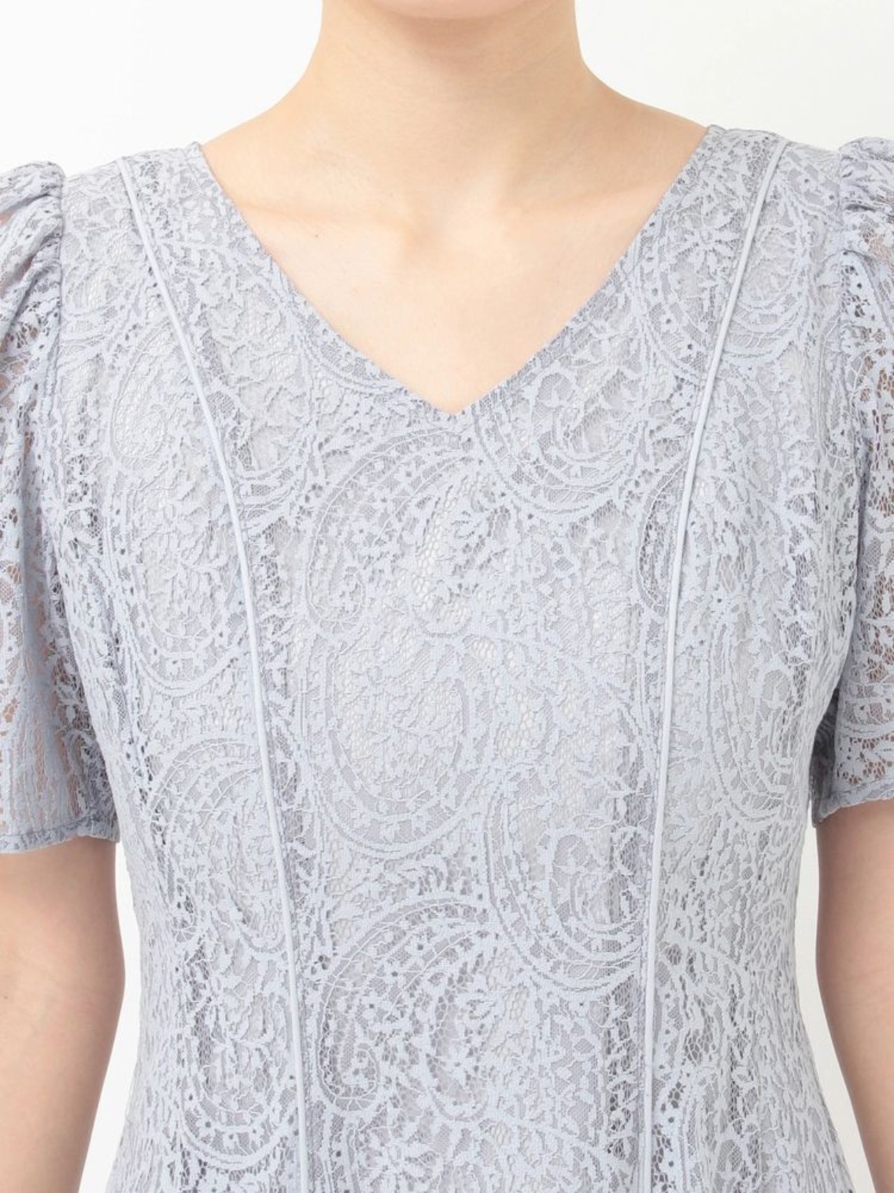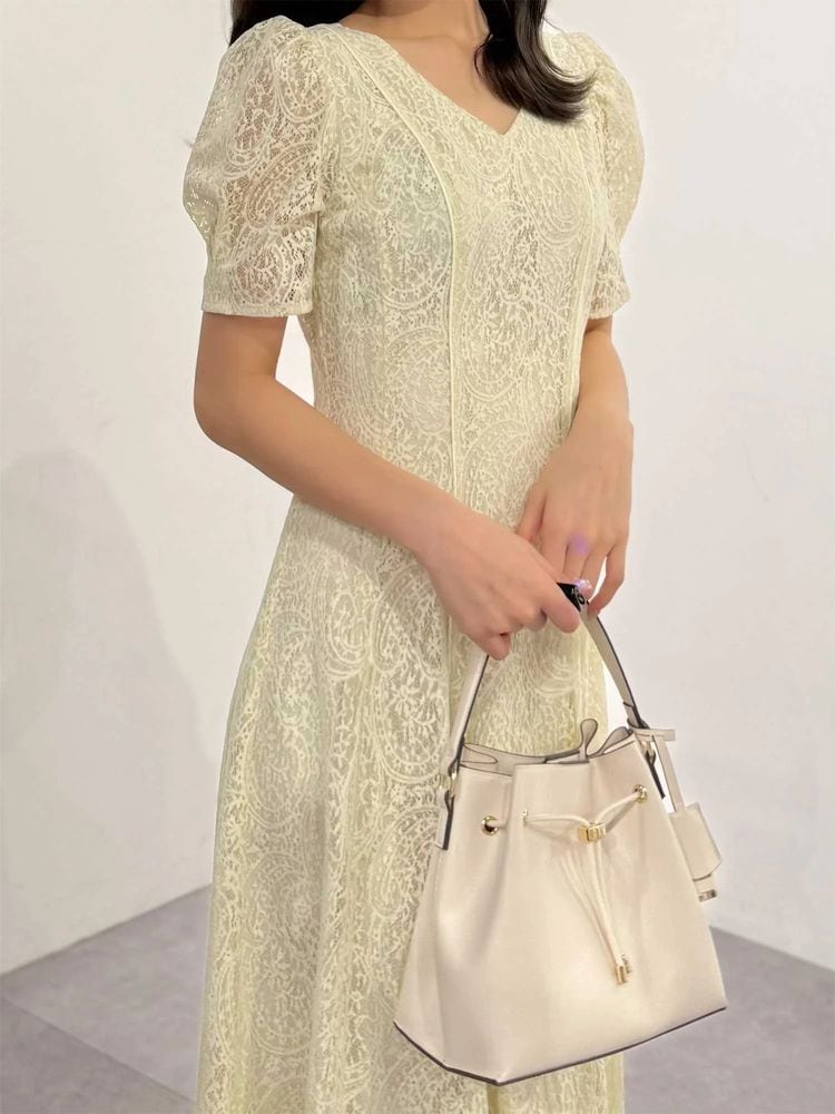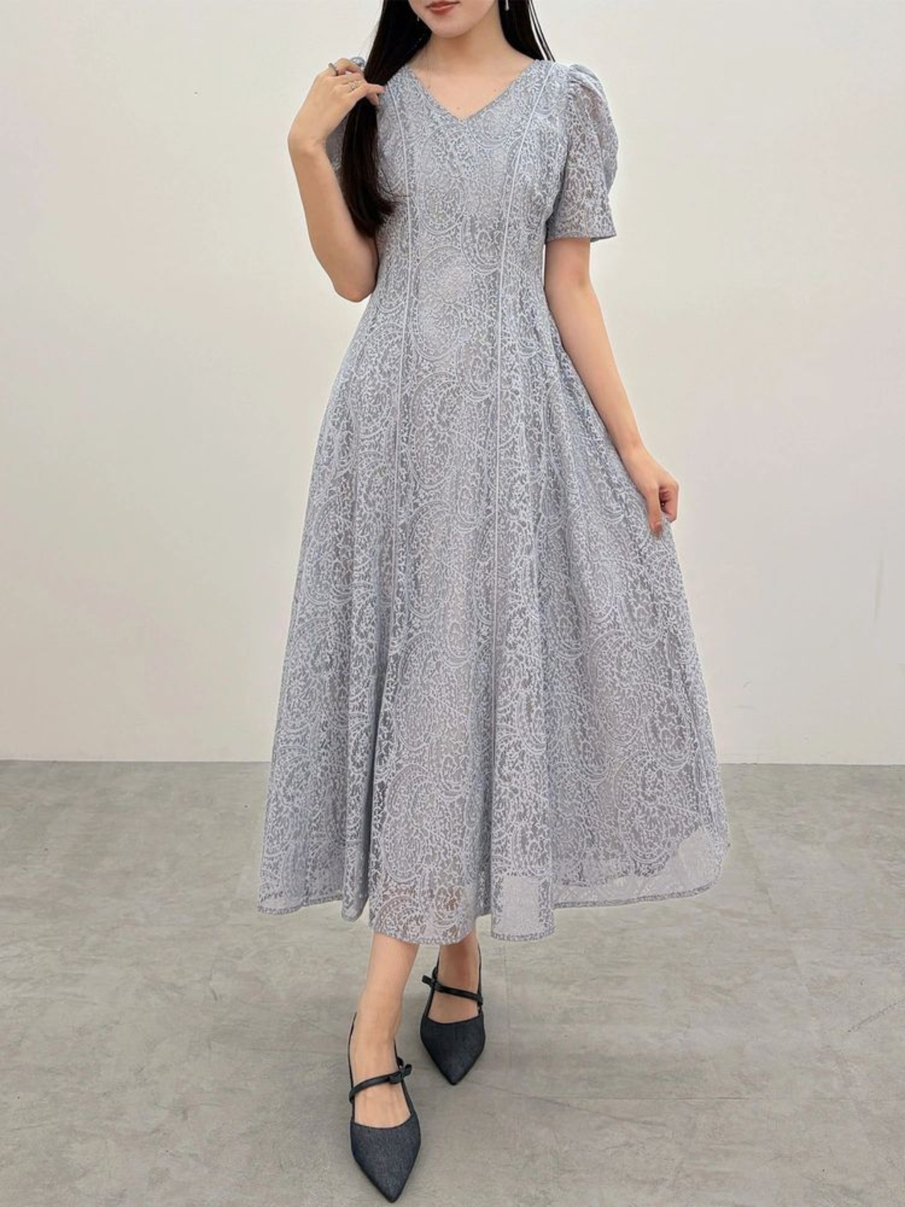 ペイズリーモチーフの繊細なレースが目を惹く、春にぴったりのフィット&フレアワンピース。