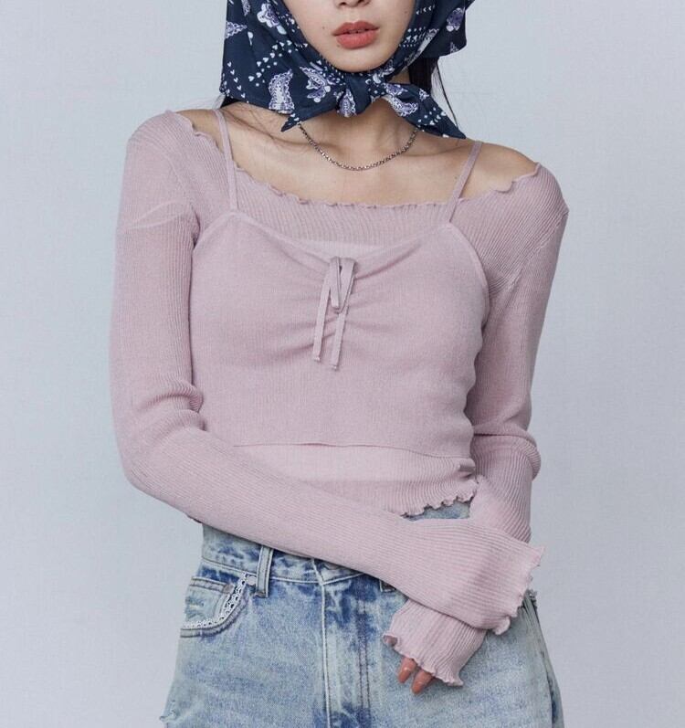 キャミソールもギャザーとリボンデザインを加えています。
