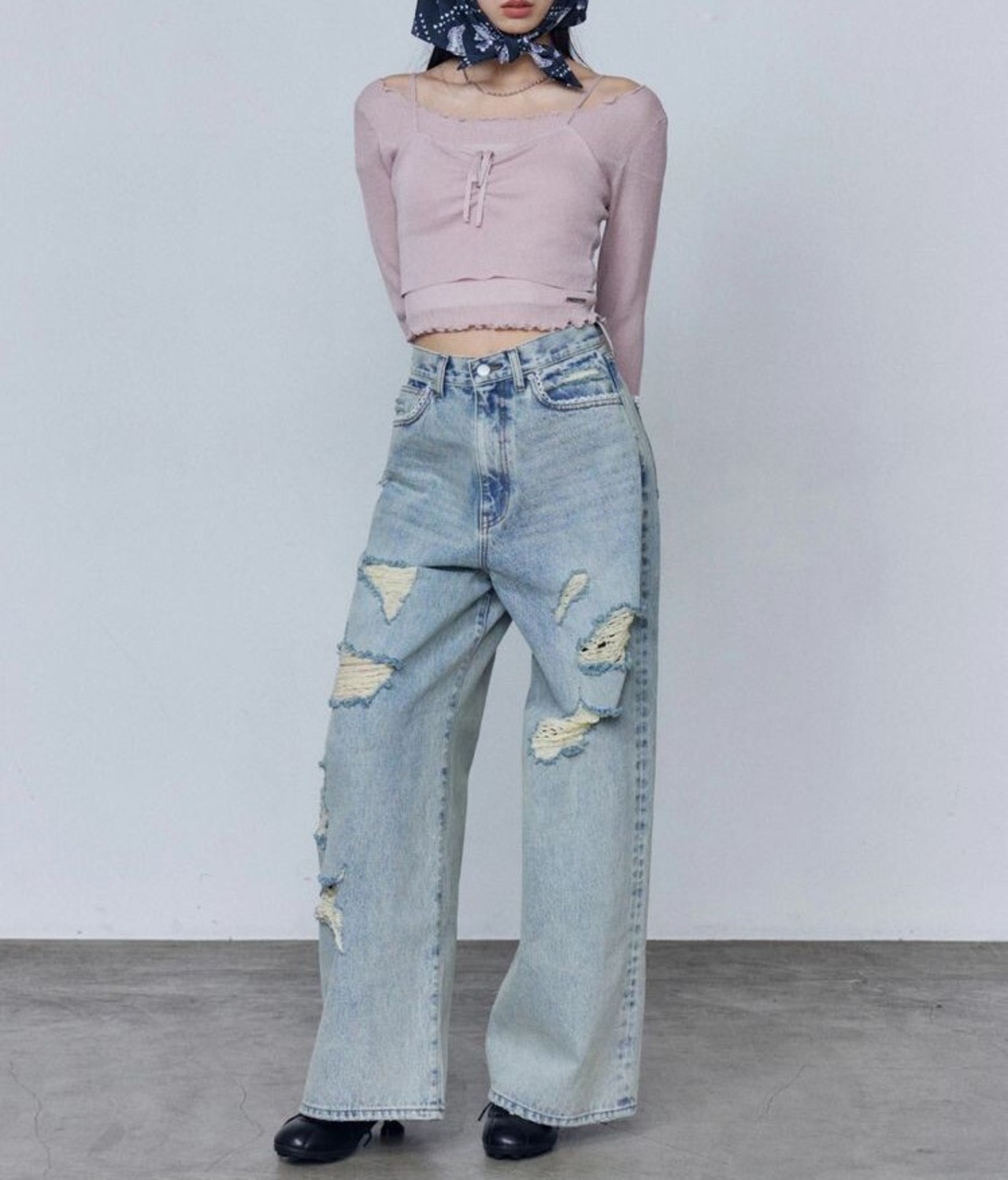 バルキーワイドハイウエストクラッシュジーンズを合わせカジュアルダウンした着こなしもおすすめです。