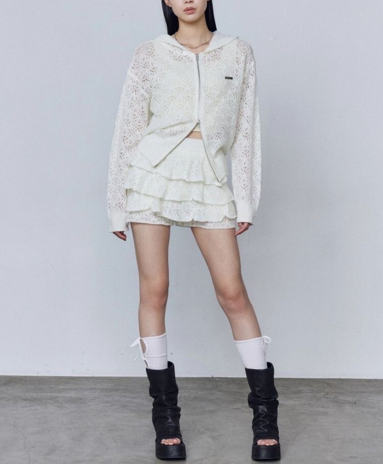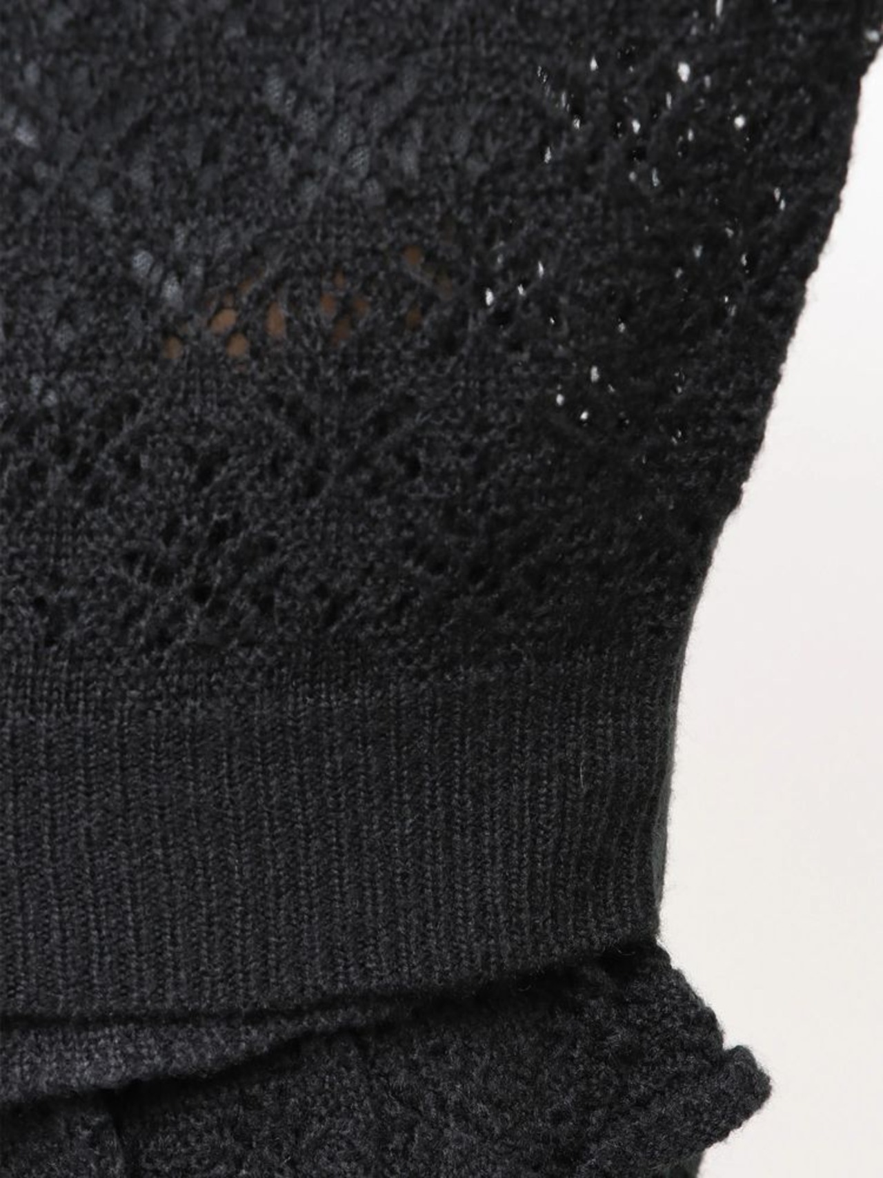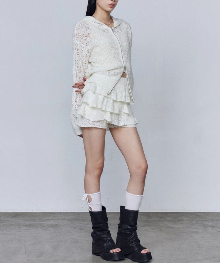 花柄の編地で程よい甘さがありつつ、肌が透ける抜け感でヘルシーな印象に。
