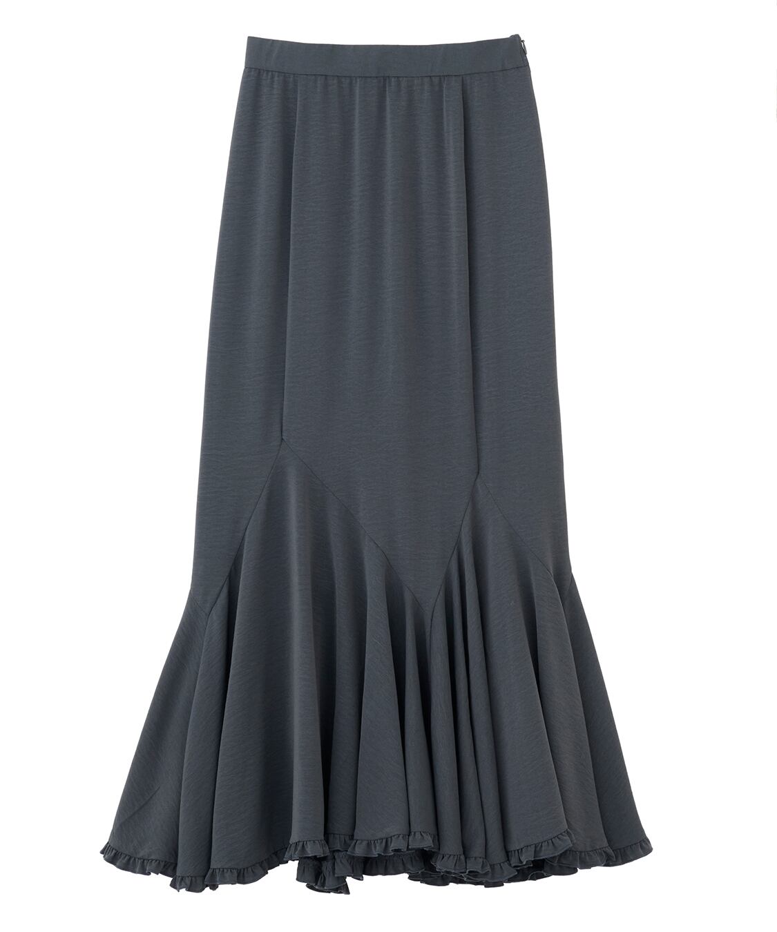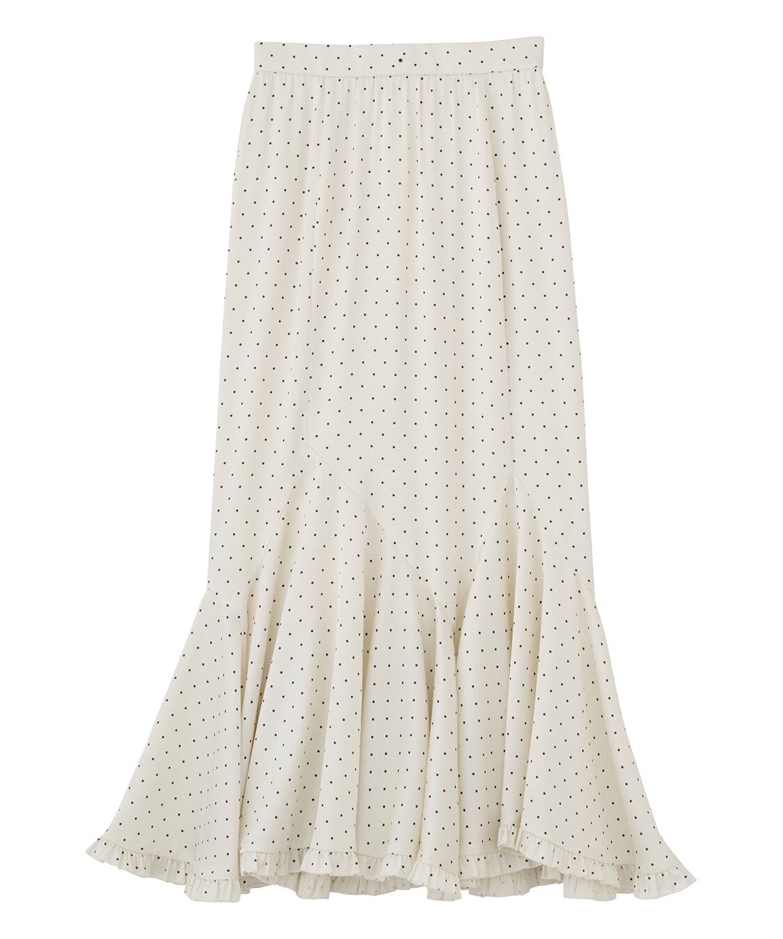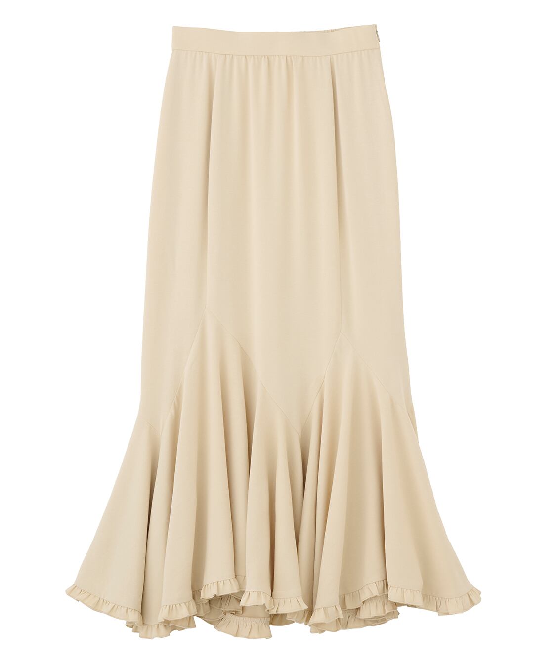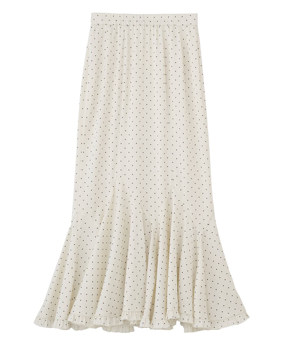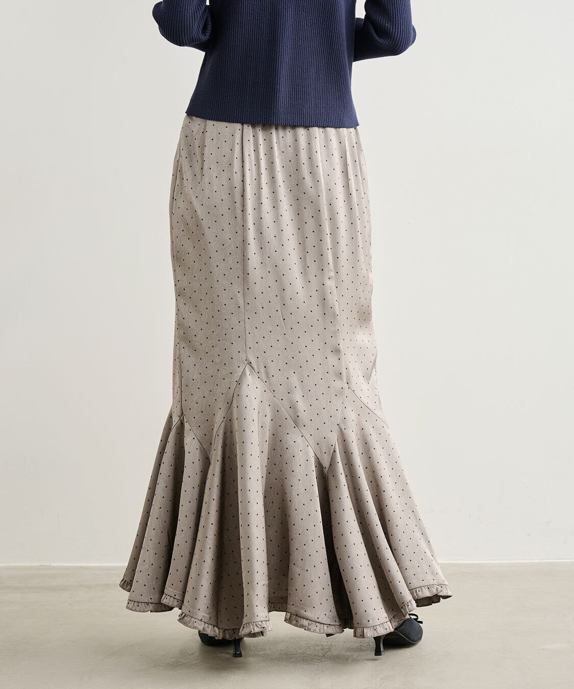 ビンテージライクなシワ感のあるサテンを使用したフリルマーメイドスカートです。合わせやすい無地とコーデのアクセントになるドットの色展開でご用意しました。ウエストから膝まではスッキリとしながらも、裾に向かって分量感を出すことでドラマティックな印象に。裾にはフリルを施すことでコーディネイトを華やかに魅せてくれる1着に仕上げました。綺麗めなニットはもちろん、カジュアルなスウェットなどに合わせたりと着回しのきく万能アイテムです。