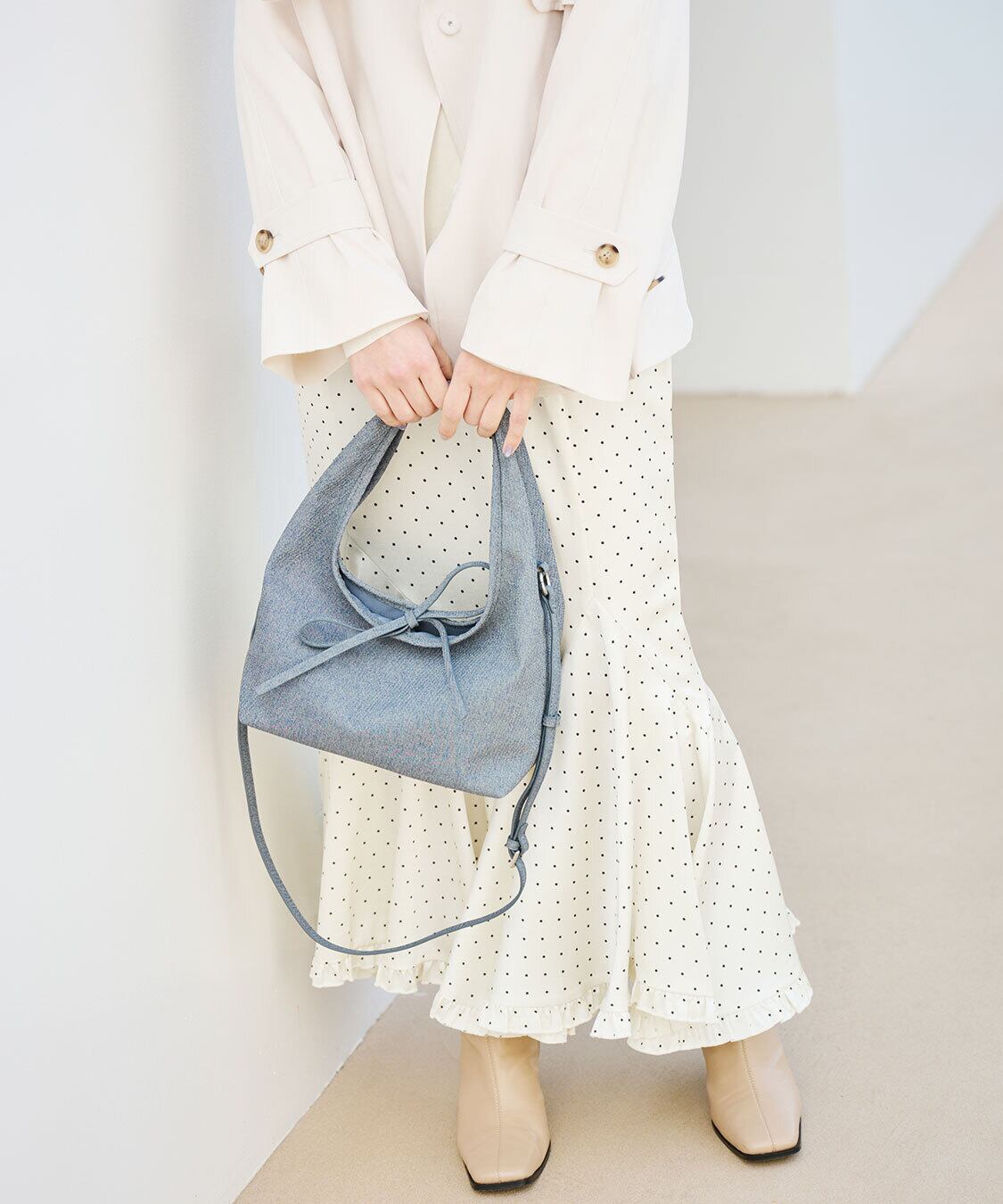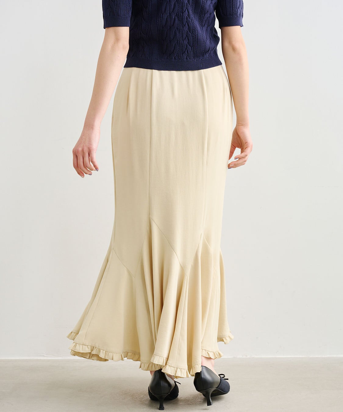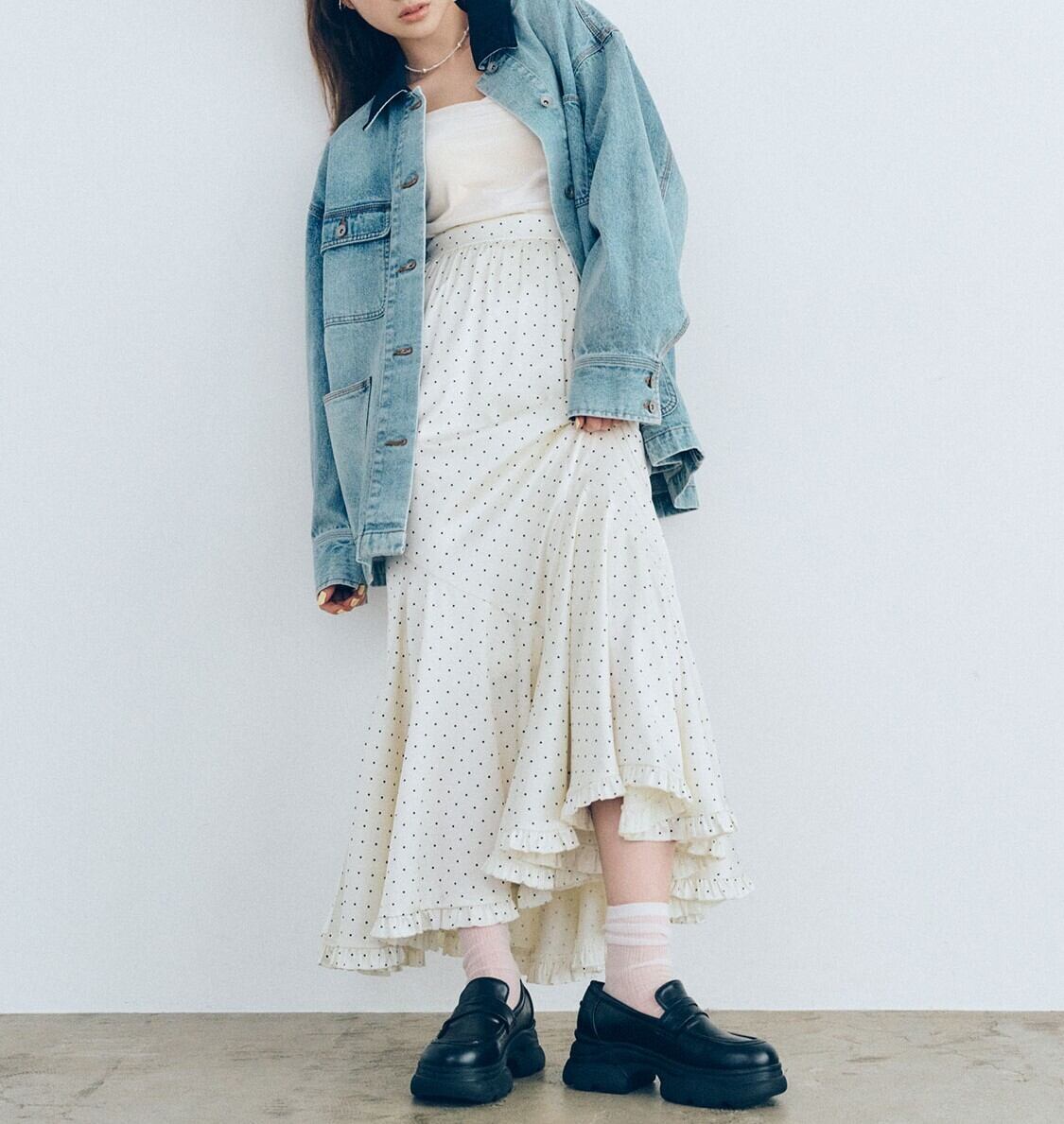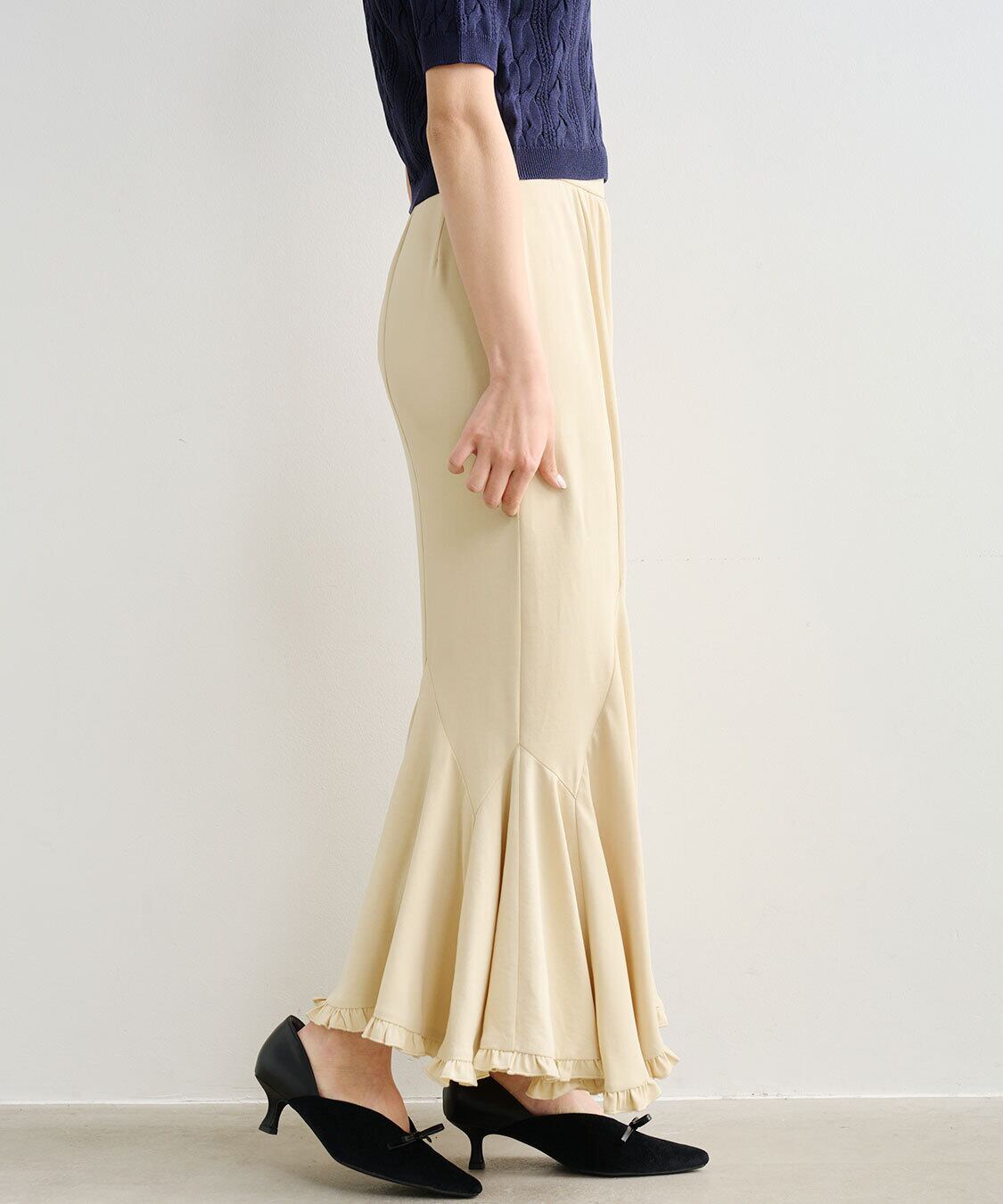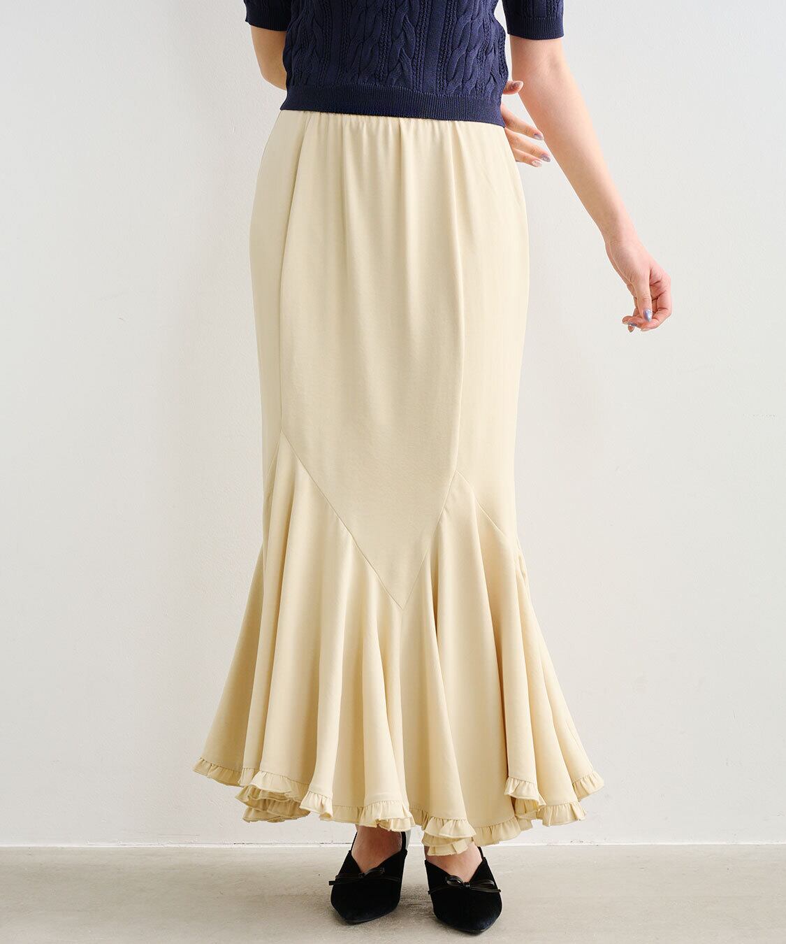 ビンテージライクなシワ感のあるサテンを使用したフリルマーメイドスカートです。合わせやすい無地とコーデのアクセントになるドットの色展開でご用意しました。ウエストから膝まではスッキリとしながらも、裾に向かって分量感を出すことでドラマティックな印象に。裾にはフリルを施すことでコーディネイトを華やかに魅せてくれる1着に仕上げました。綺麗めなニットはもちろん、カジュアルなスウェットなどに合わせたりと着回しのきく万能アイテムです。