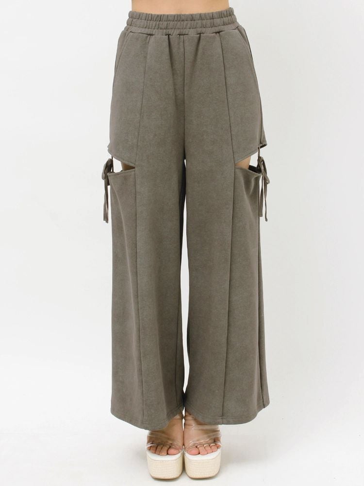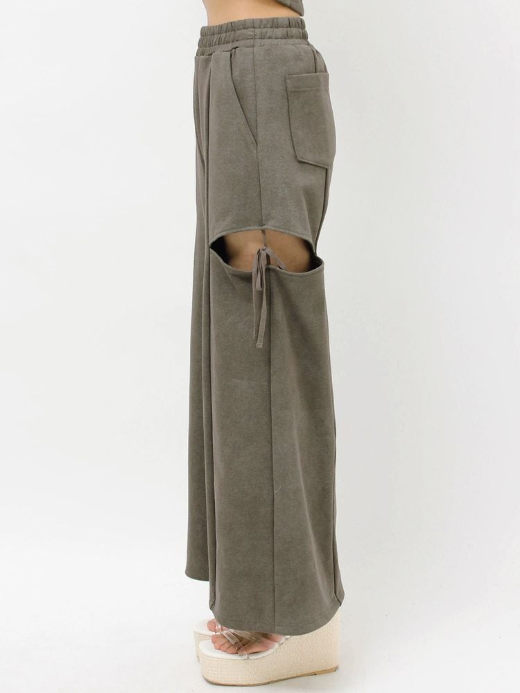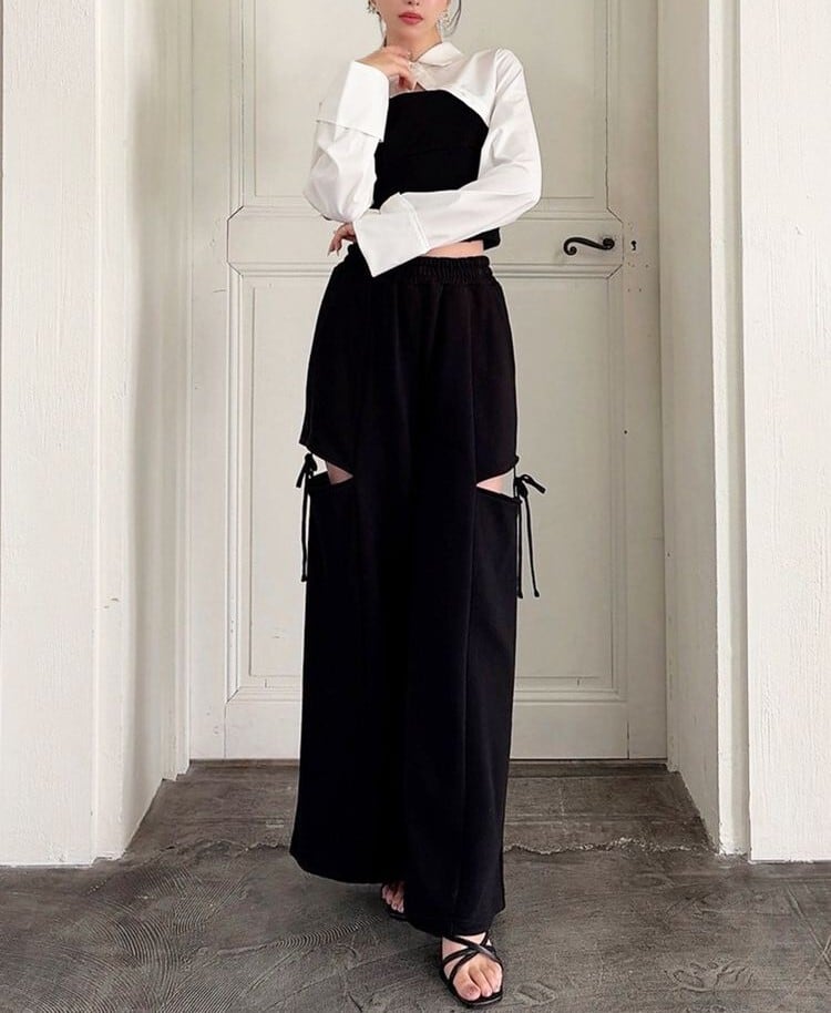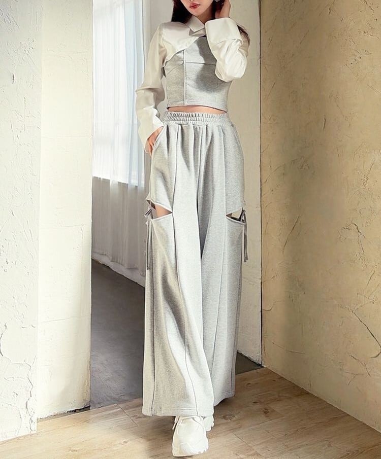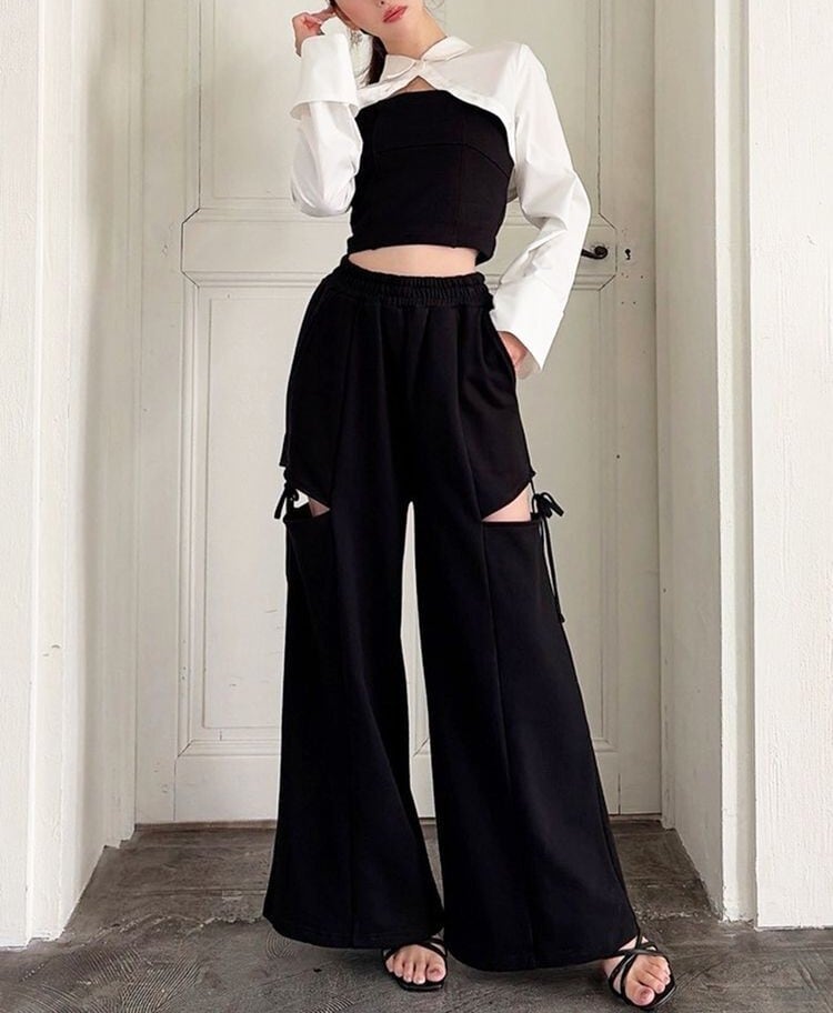 人気のカットアウトの肌見せ+リボンデザインのスウェットパンツ。