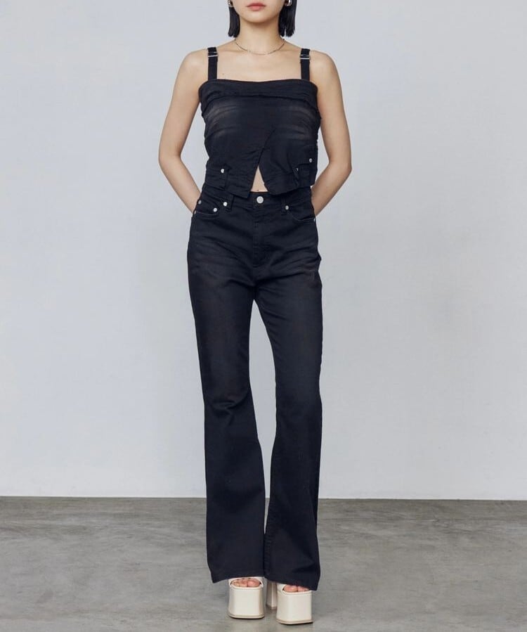 1枚ではもちろん、肌寒い時期はストラップシアートップスを合わせたスタイリングがおすすめ。足元はスキンラインバルキーサンダルと合わせて頂くと脚長効果も抜群です。