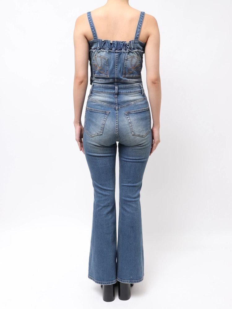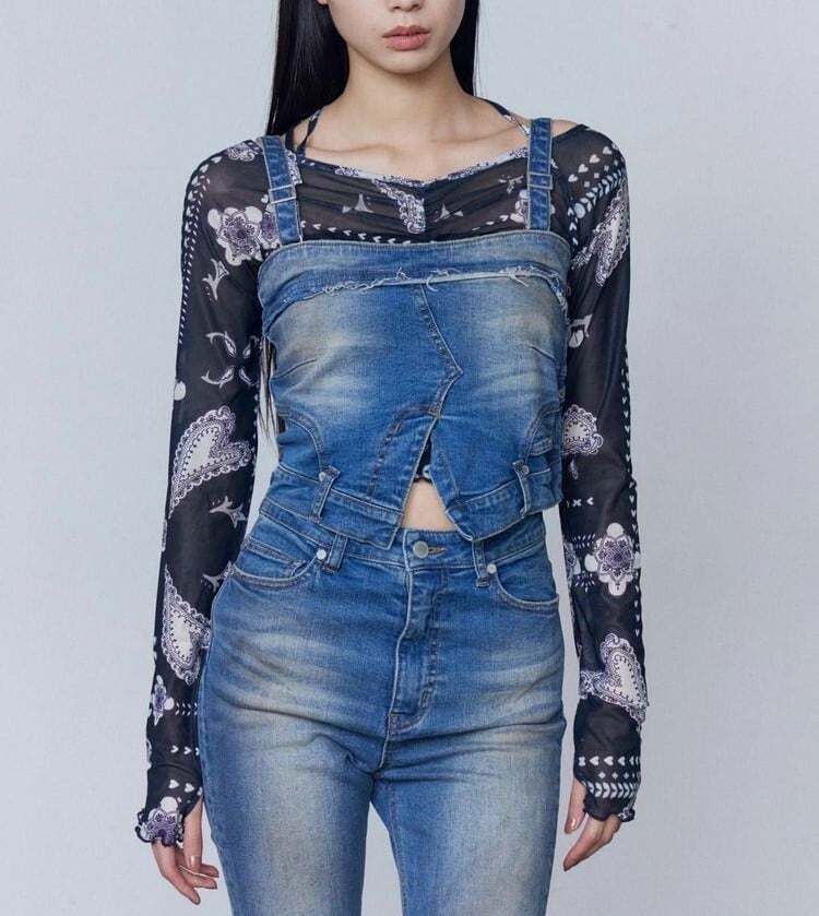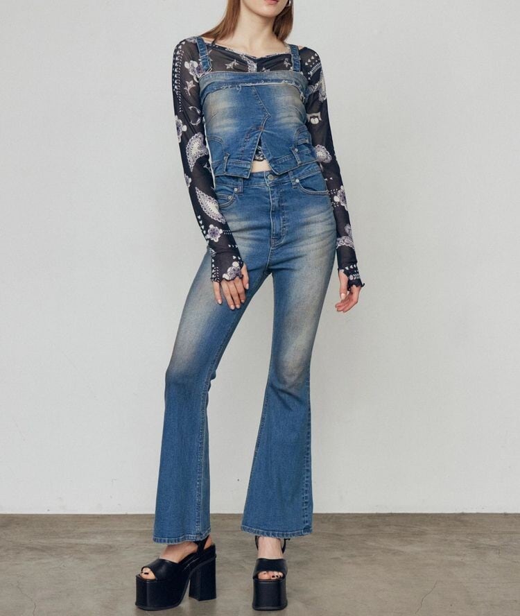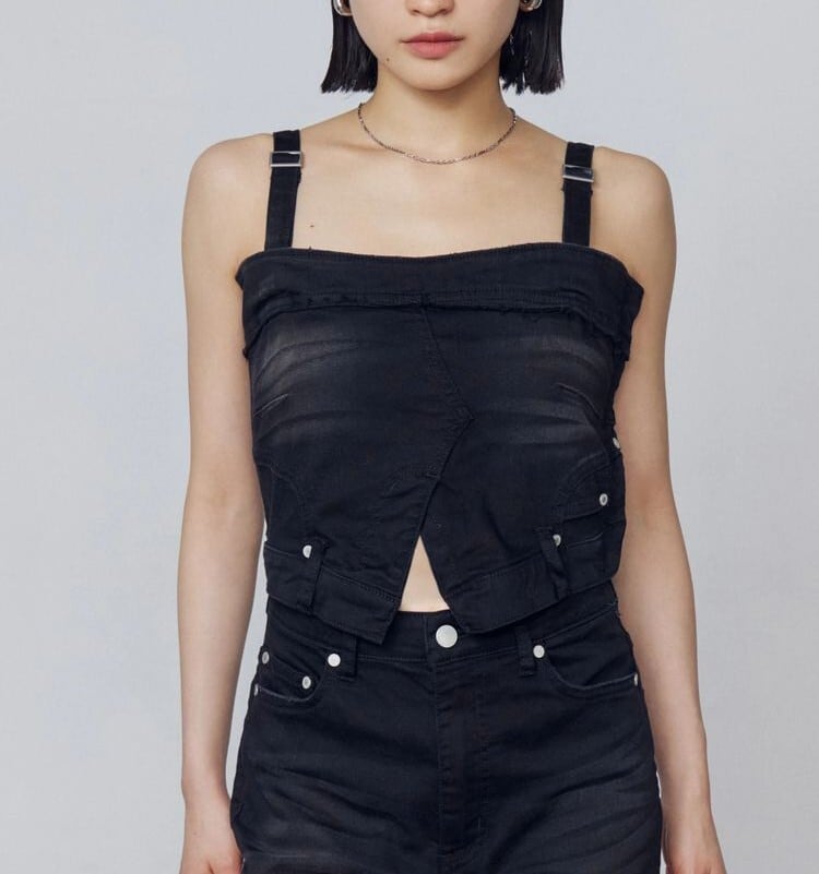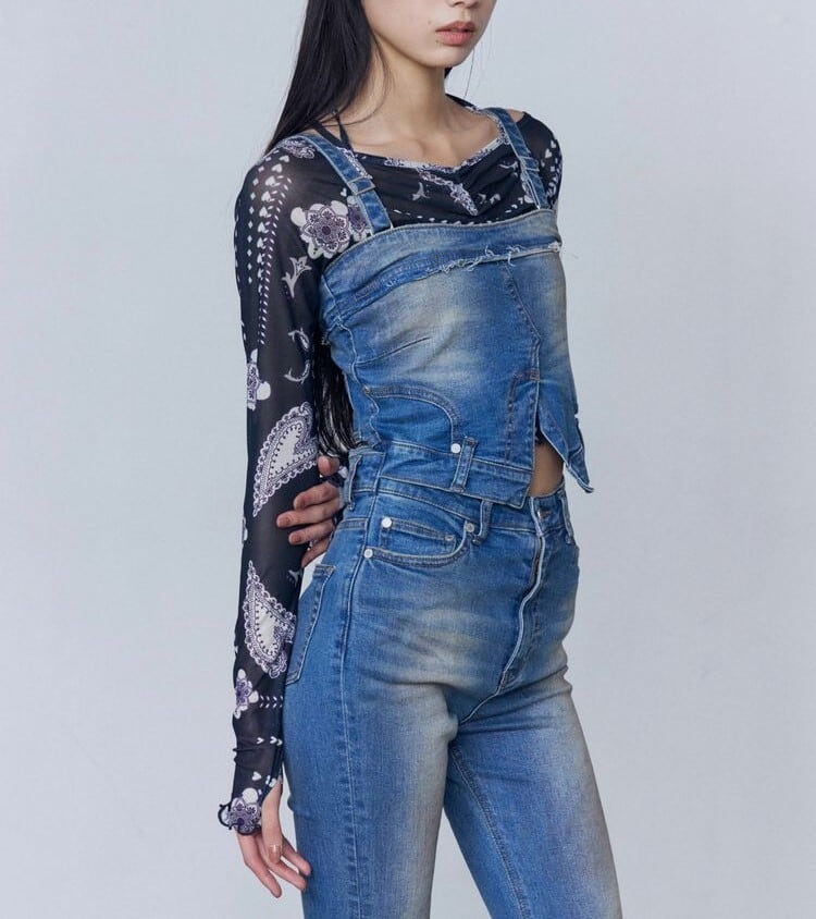 トップス部分はデニムパンツを上下逆にしたようなデザインで、モード感のあるEMODA(エモダ)らしい存在感のある1着です。