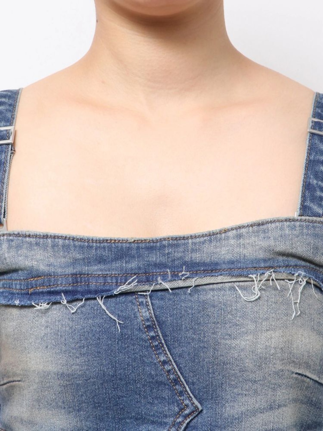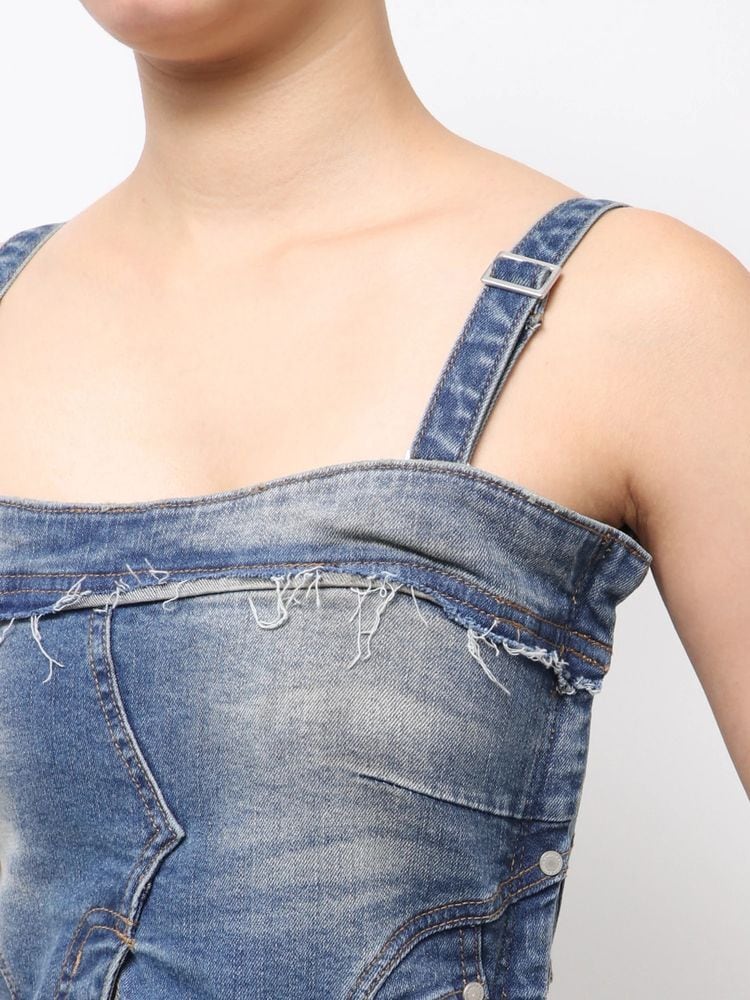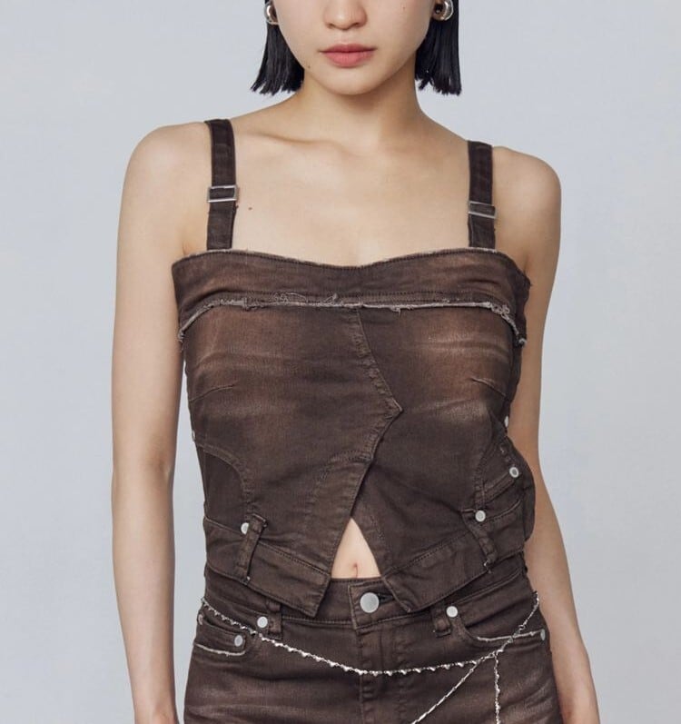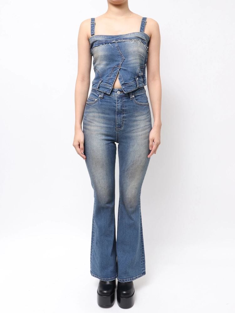 トップス部分はデニムパンツを上下逆にしたようなデザインで、モード感のあるEMODA(エモダ)らしい存在感のある1着です。