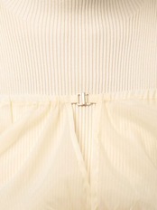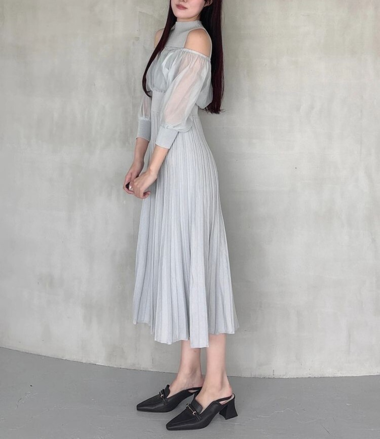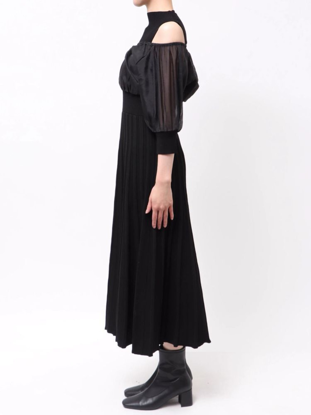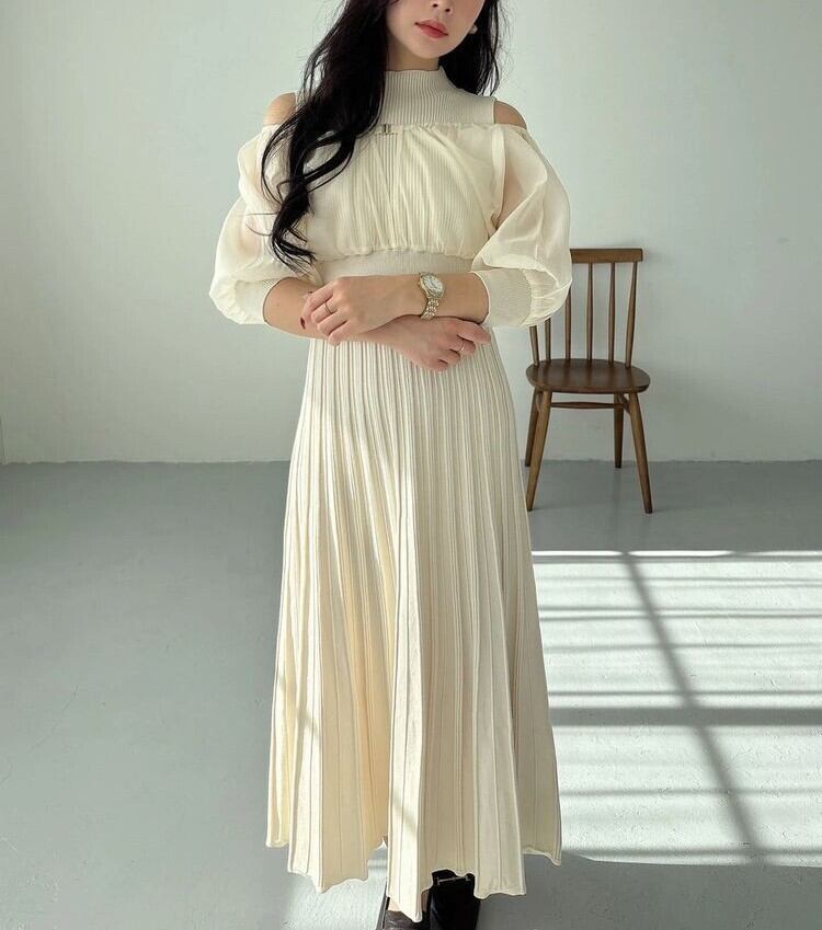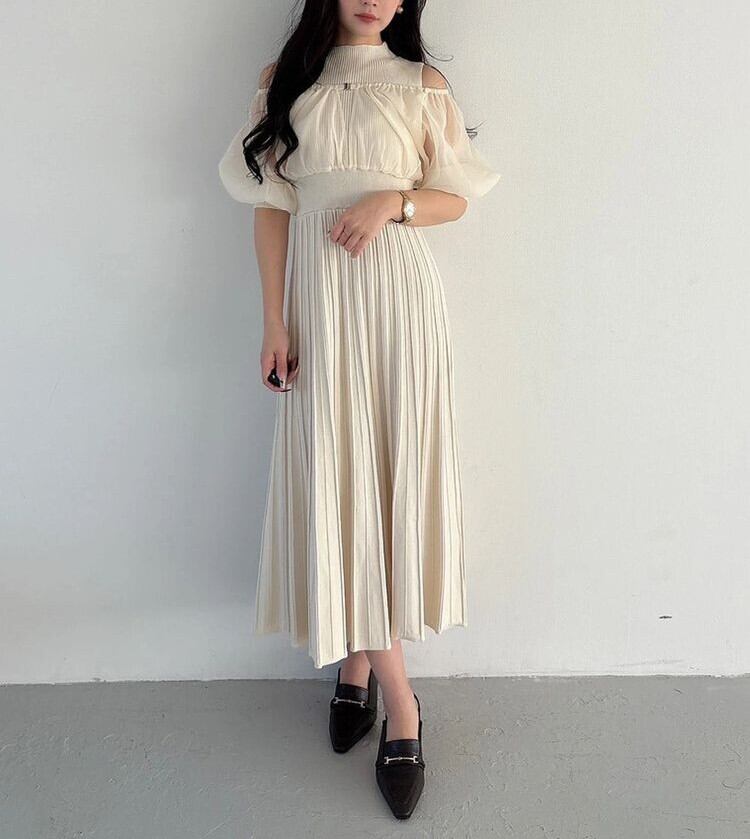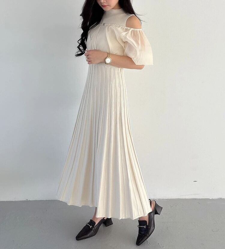 中に重ねたニットワンピは、ノースリーブのボトルネック×ウエスト切替えのフィット&フレアシルエットで、上品さと女性らしさを自然に引き立てます。